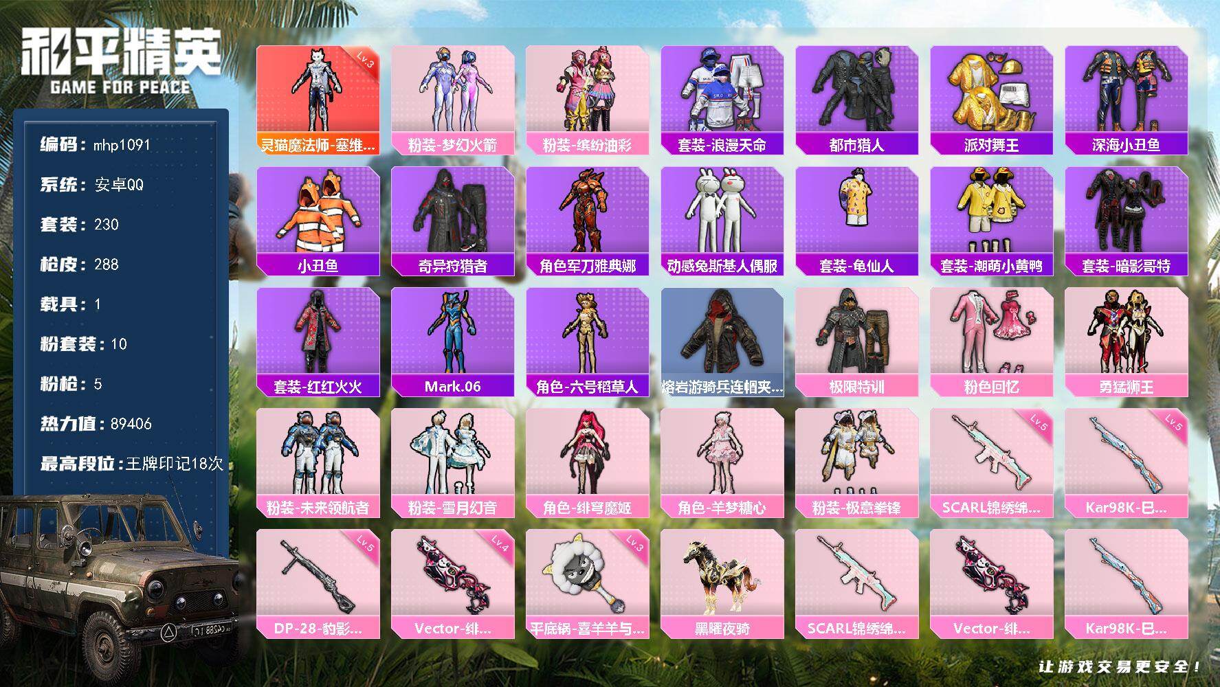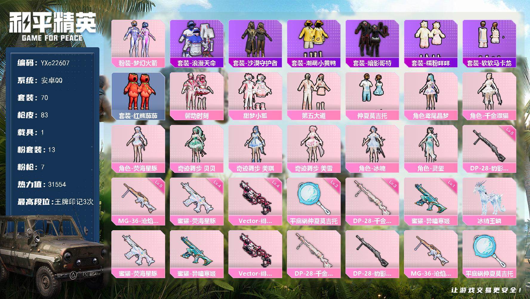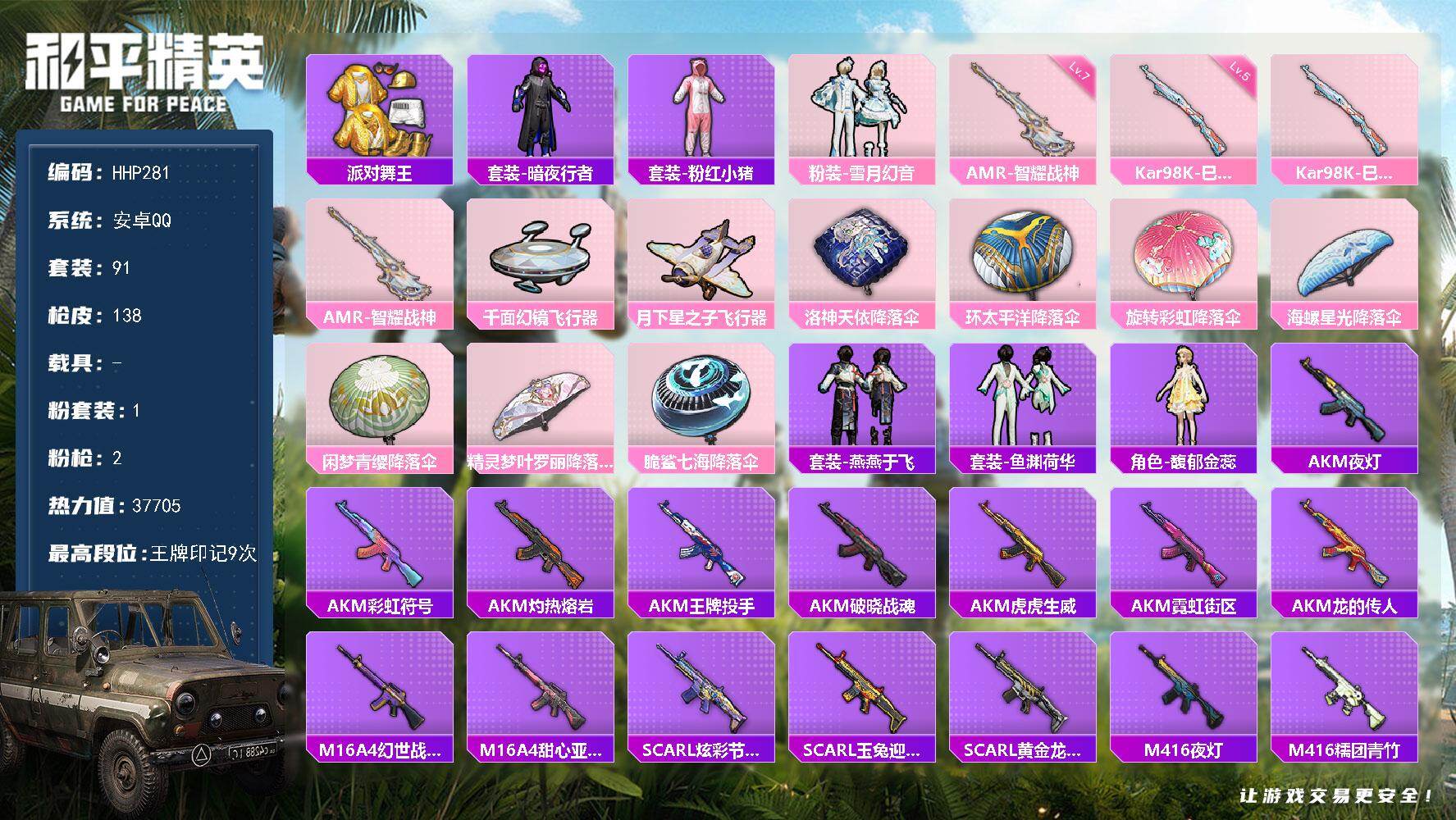 安卓 手Q-1神装-4粉装-9特效枪-2载具-2粉色飞行器-33980热力值-