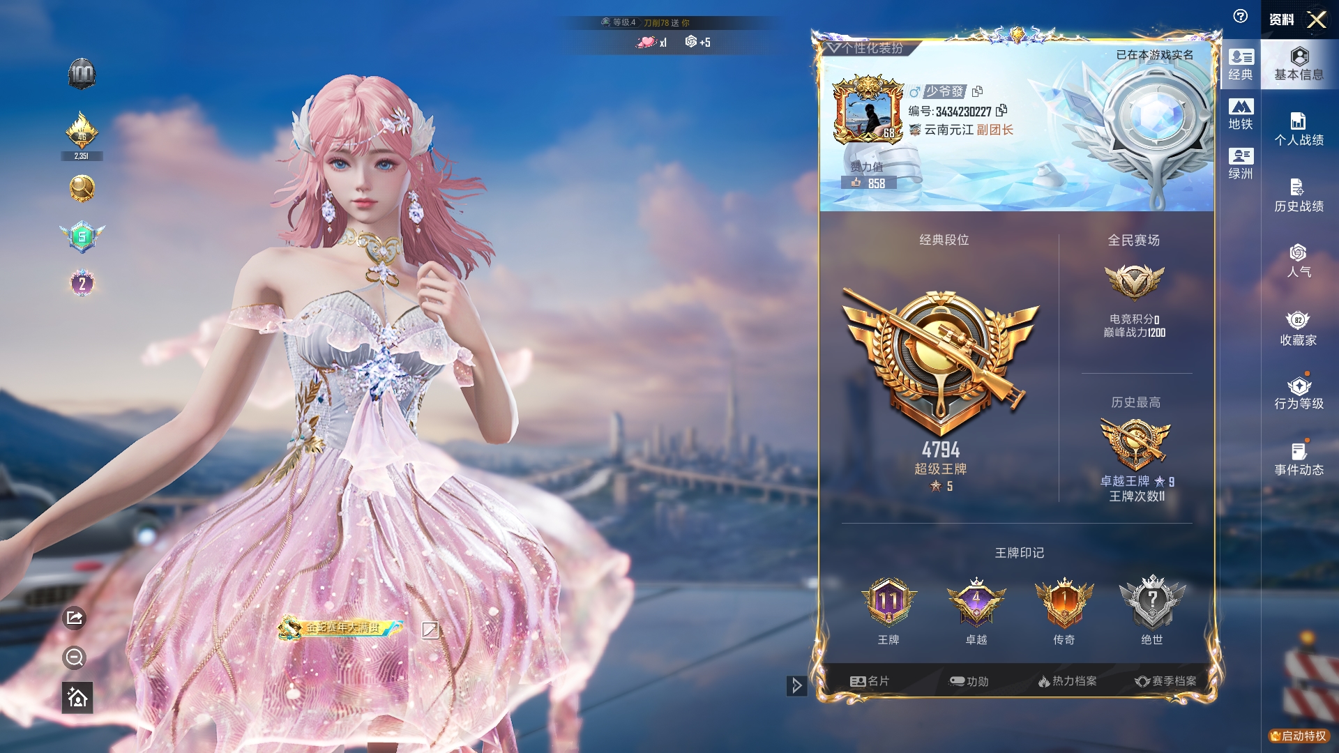 a4223/苹果QQ/热力值:113566,1神装,20粉装,17粉枪,7载具,33粉色战备,214