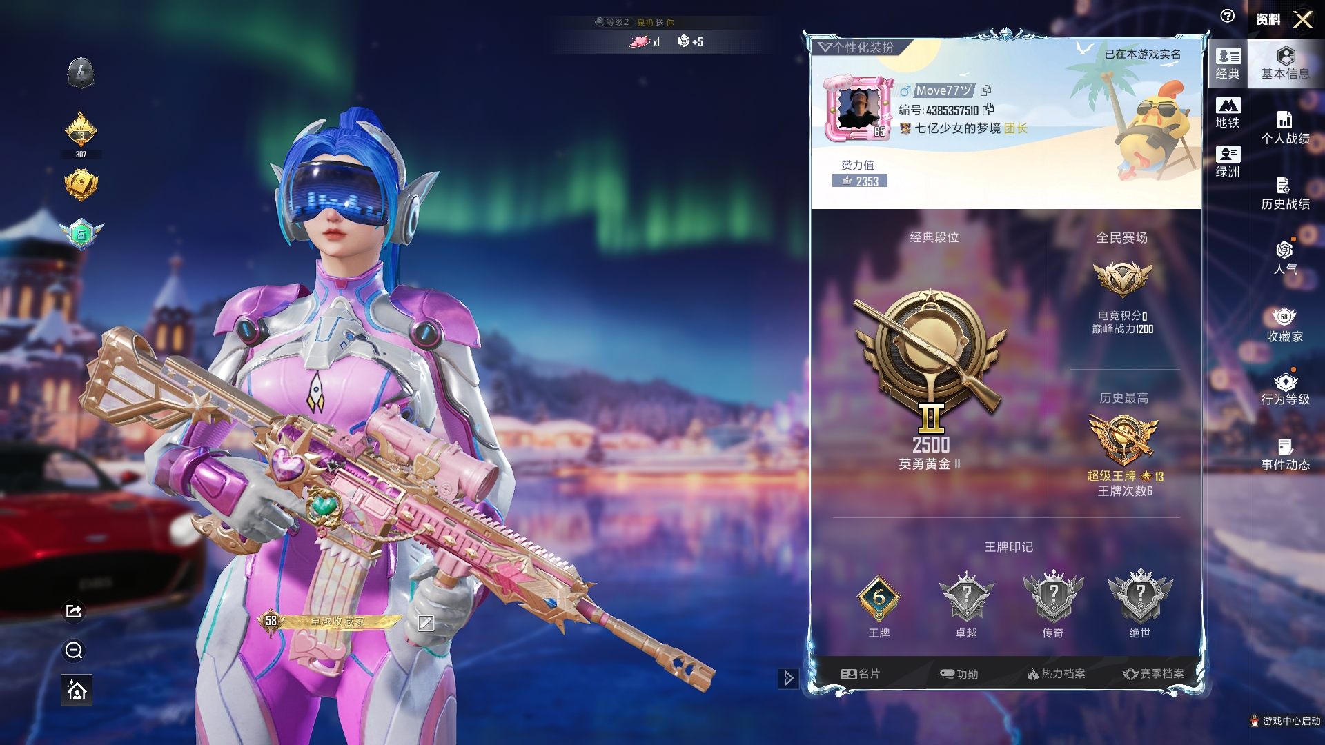 a4221/苹果v/热力值:104671,3神装,13粉装,13粉枪,6载具,27粉色战备,184