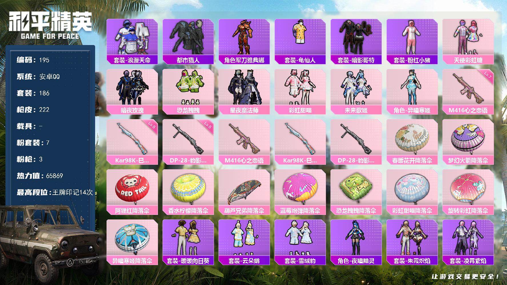 安卓 手Q-7粉装-3特效枪-0载具-0粉色飞行器-65869热力值-14王牌