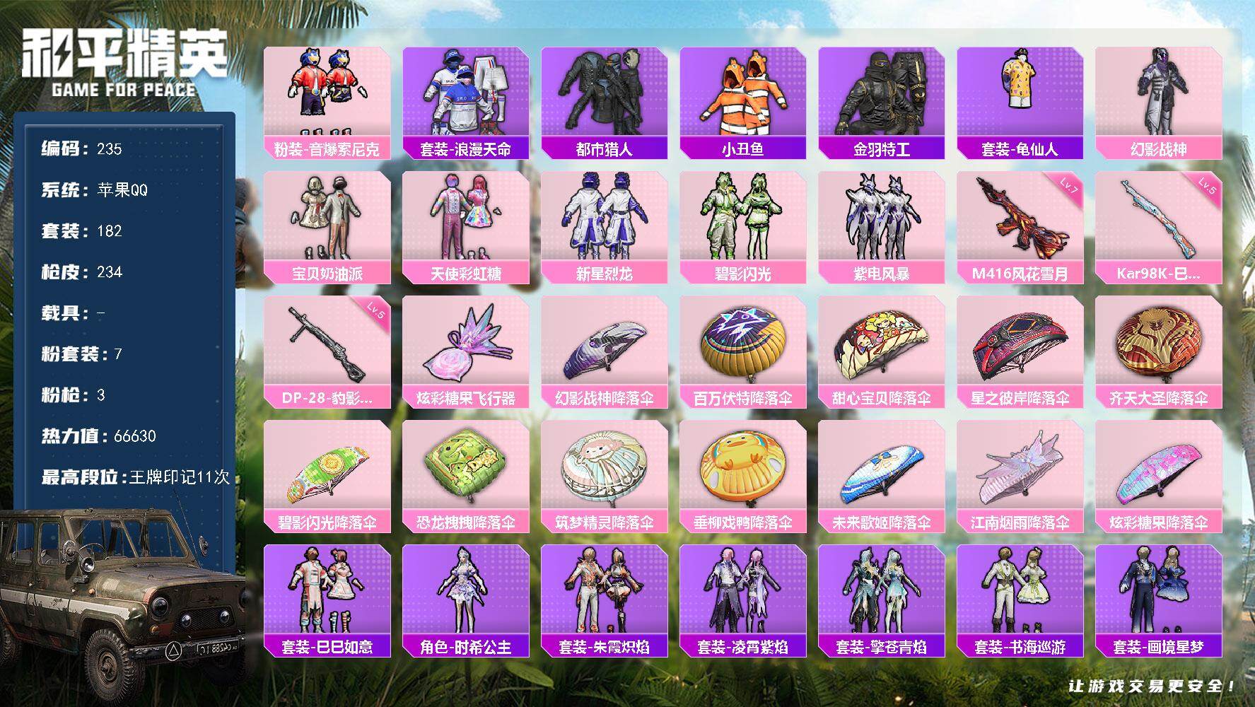 苹果 手Q-1粉装-8特效枪-0载具-1粉色飞行器-55634热力值-18王牌