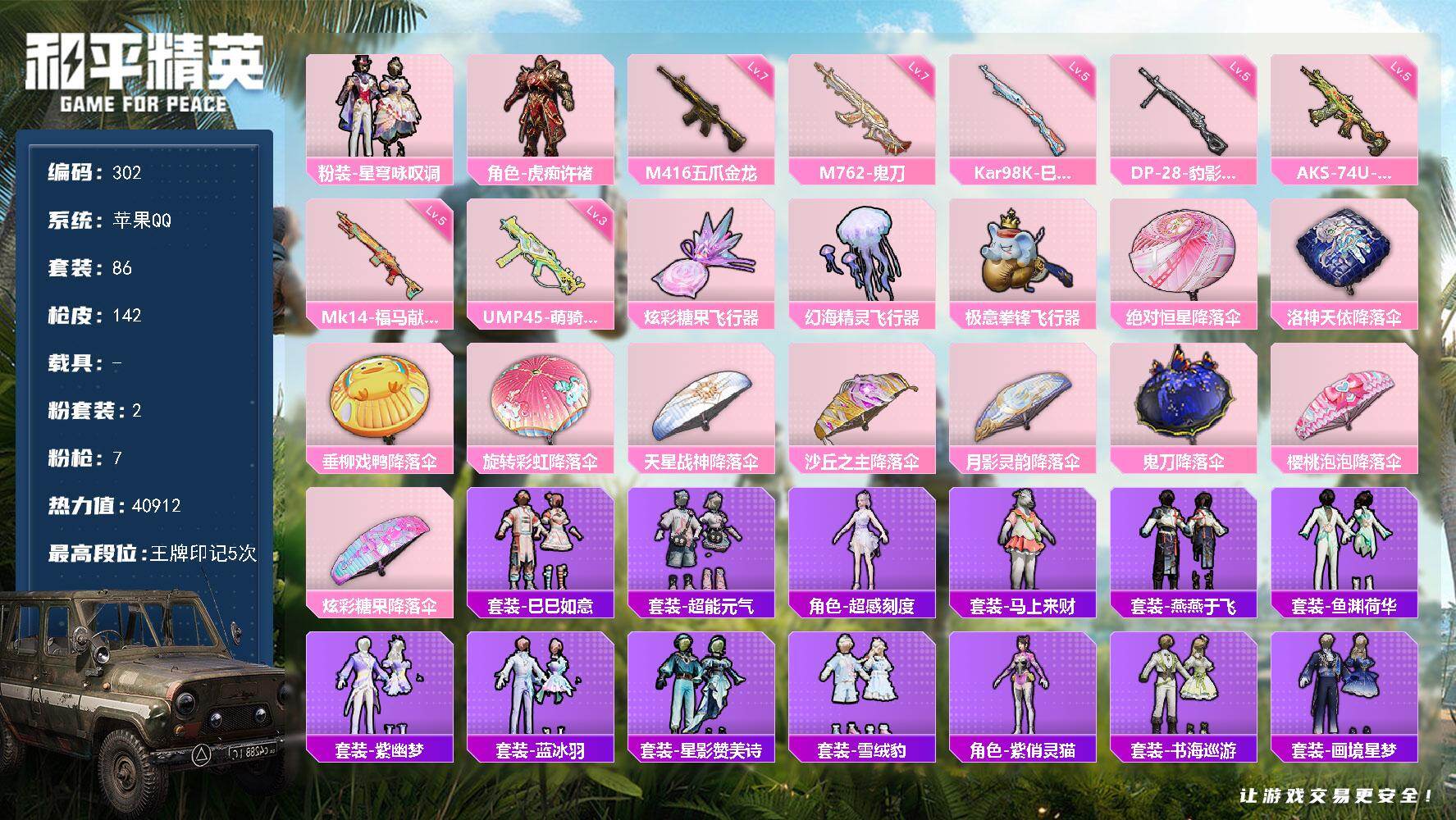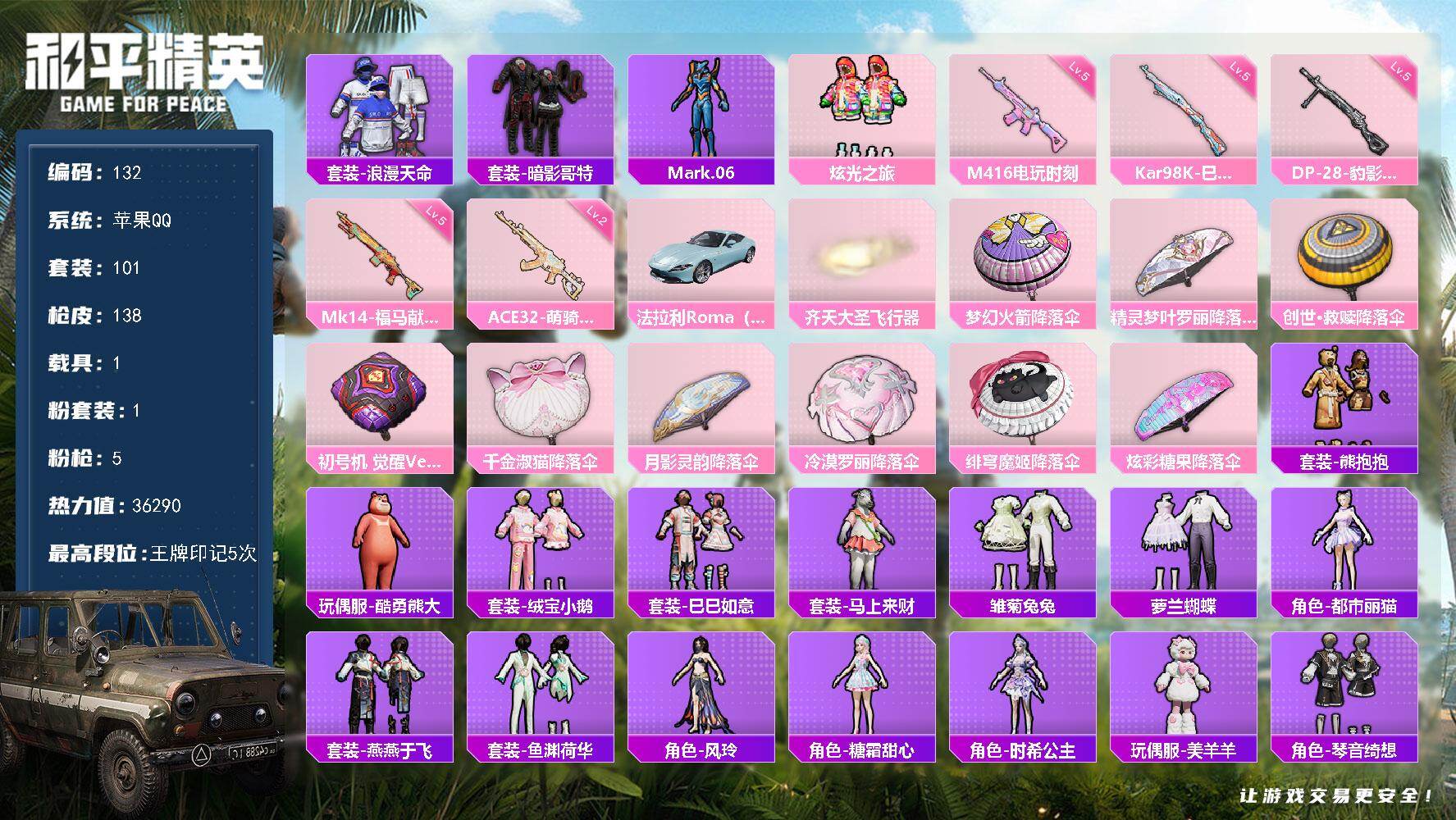 苹果 手Q-3粉装-5特效枪-0载具-1粉色飞行器-35657热力值-6王牌印