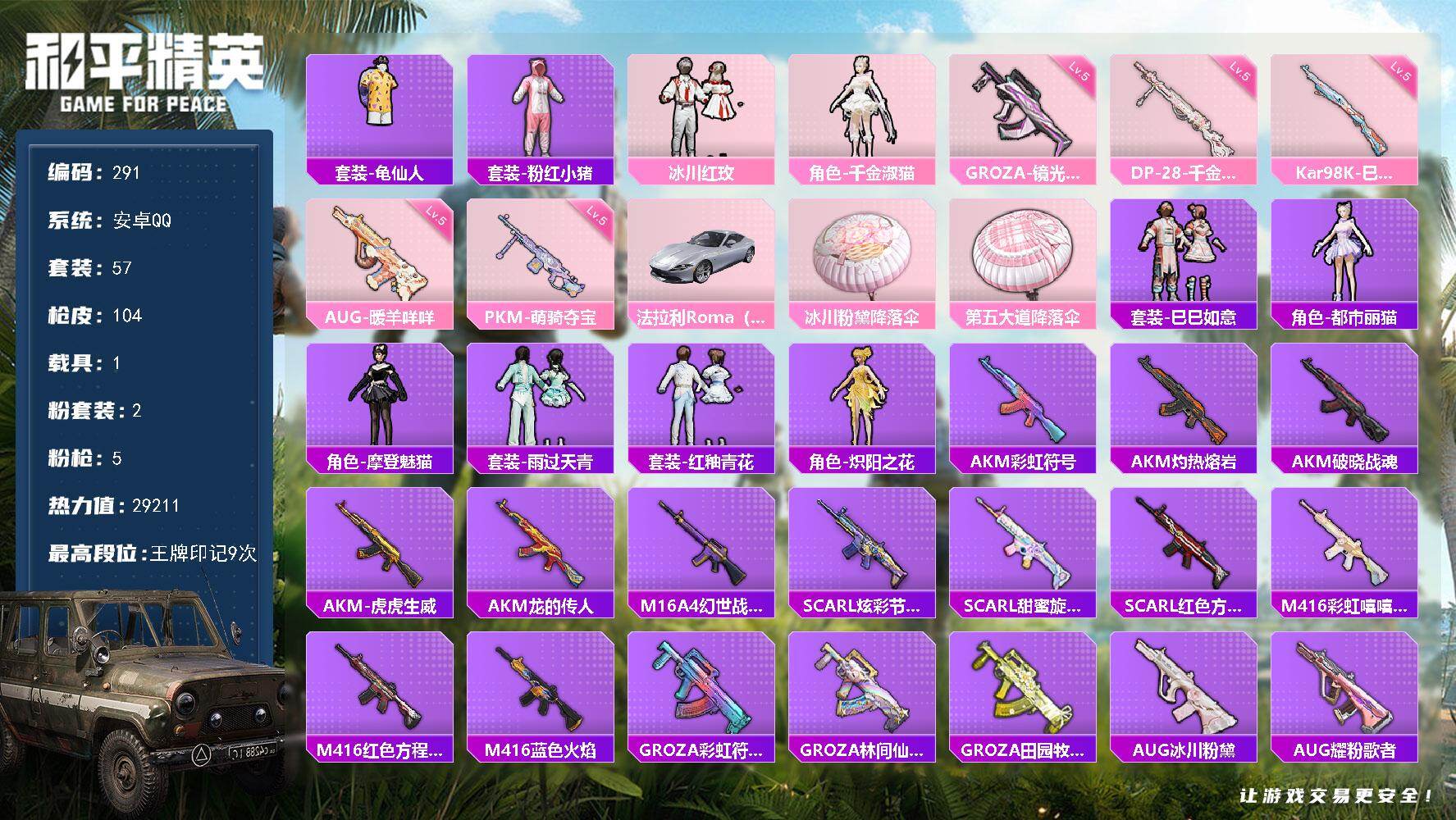 安卓 手Q-2粉装-5特效枪-0载具-0粉色飞行器-26648热力值-4王牌印