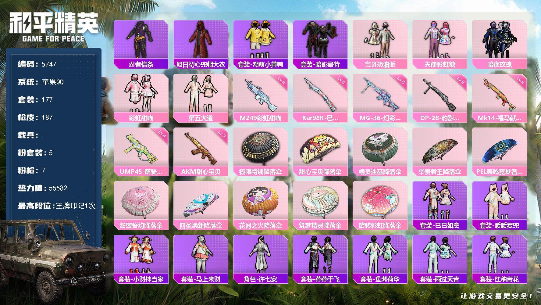 苹果 手Q-4粉装-5特效枪-1载具-3粉色飞行器-63943热力值-12王牌