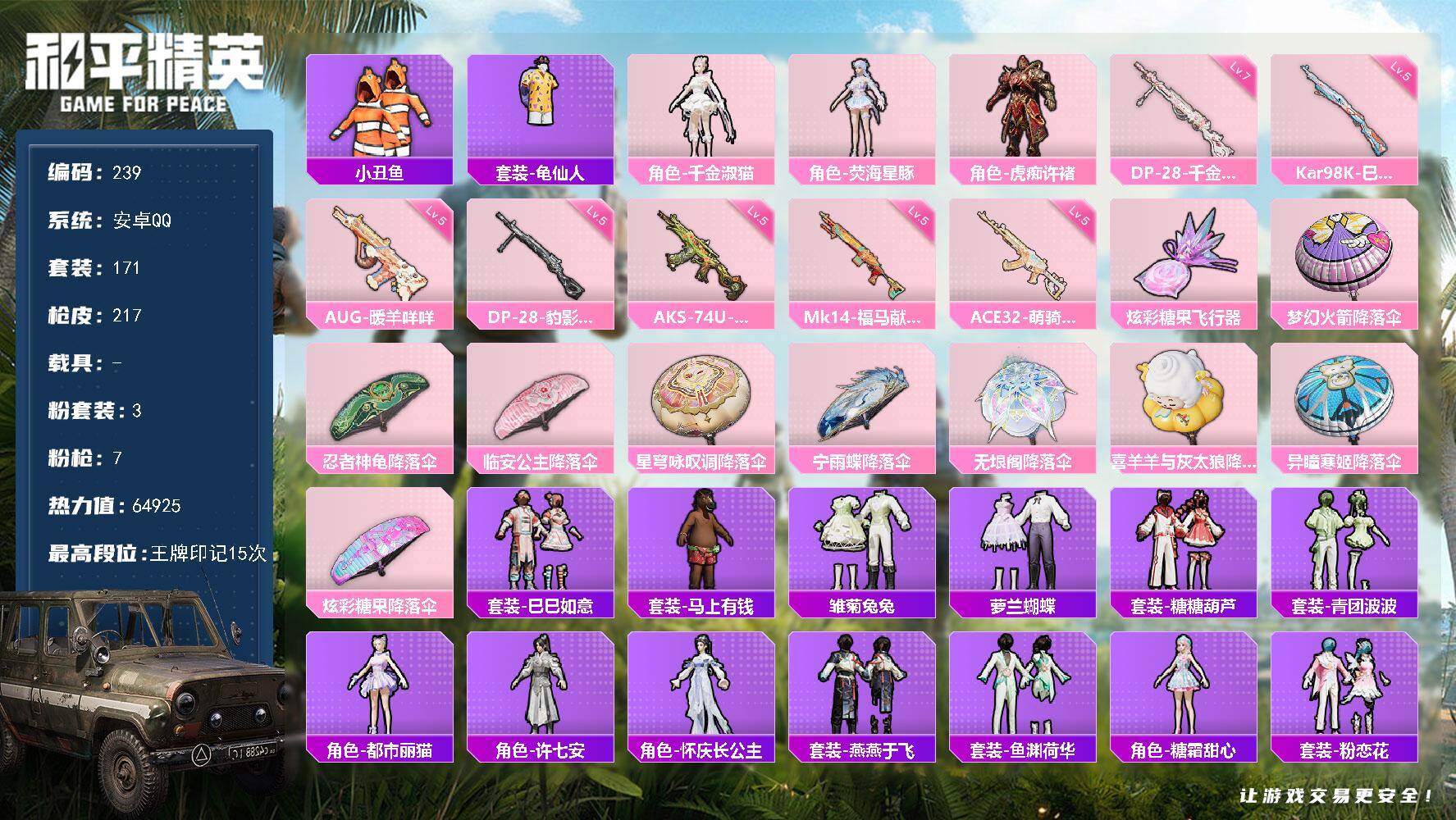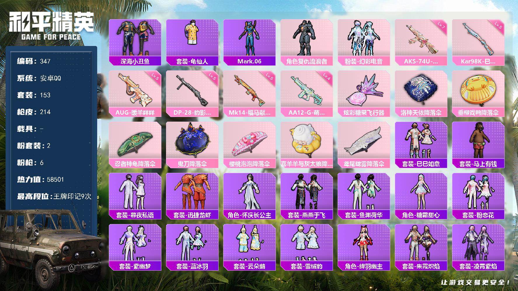 安卓 手Q-5粉装-4特效枪-0载具-4粉色飞行器-46824热力值-2王牌印