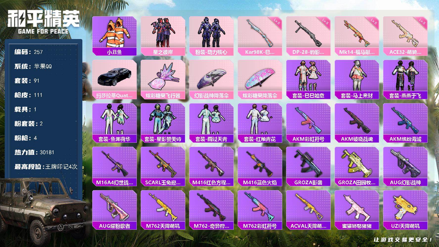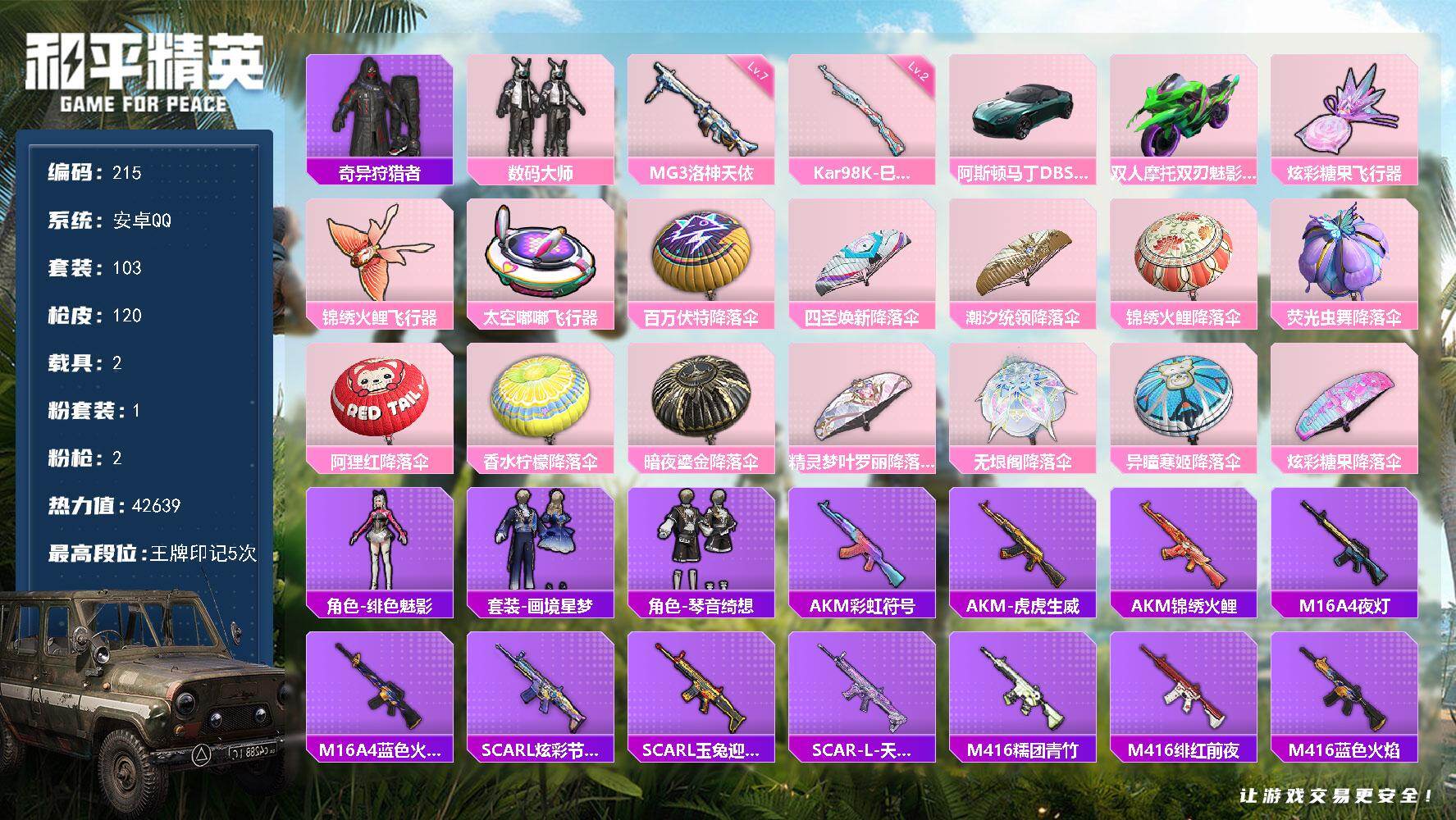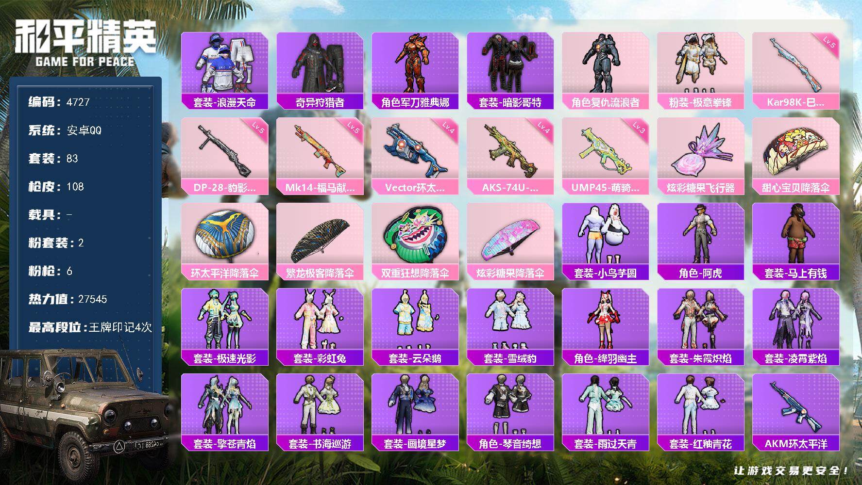 安卓 手Q-2粉装-5特效枪-0载具-0粉色飞行器-26648热力值-4王牌印