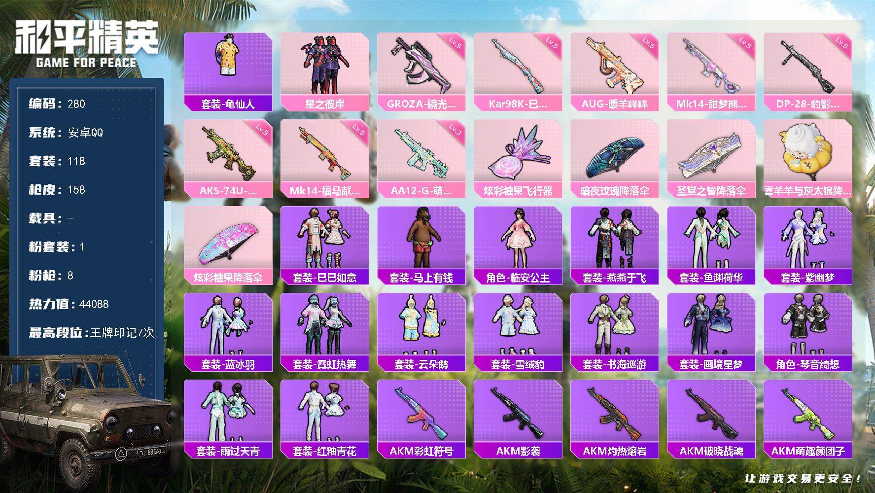 【8特效枪3粉装 秒换绑不用等】 安卓Q区-34899热力值-87套装-124