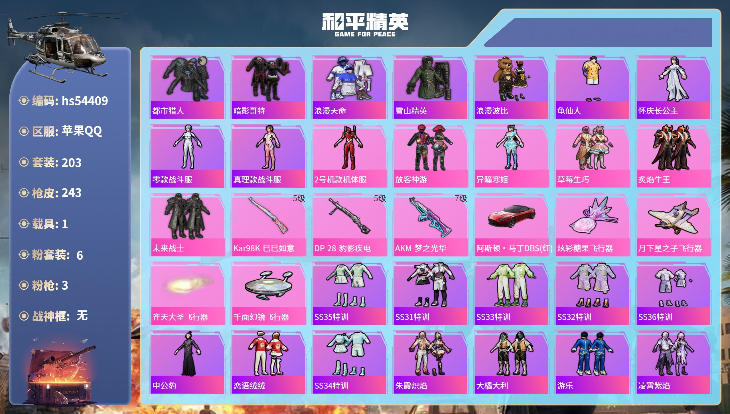hs54409 苹果手Q-18王牌印记-6粉装-3特效枪-1载具-75459热力值-203套装-24