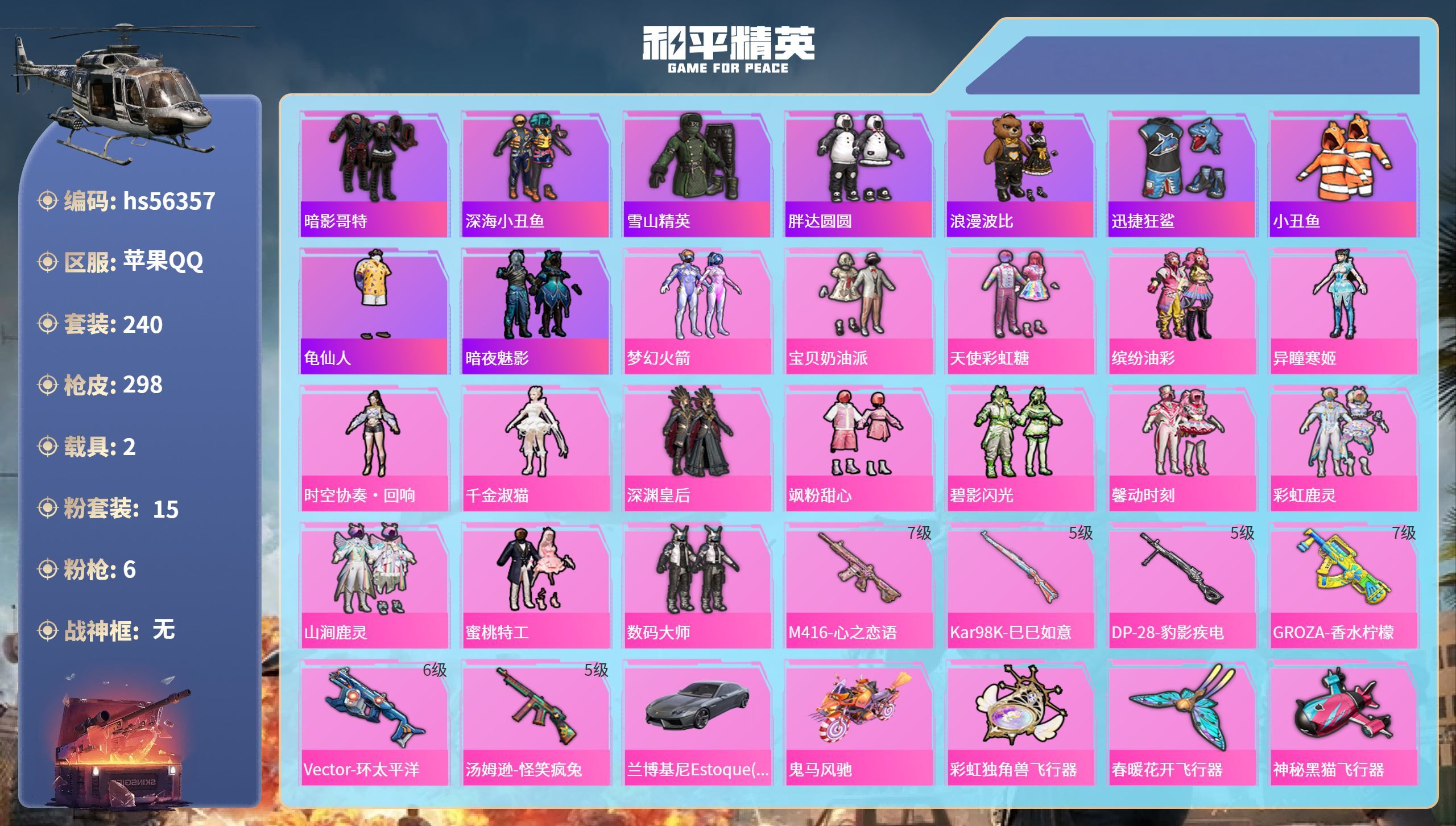hs56357 苹果手Q-24王牌印记-15粉装-6特效枪-2载具-102088热力值-240套装-