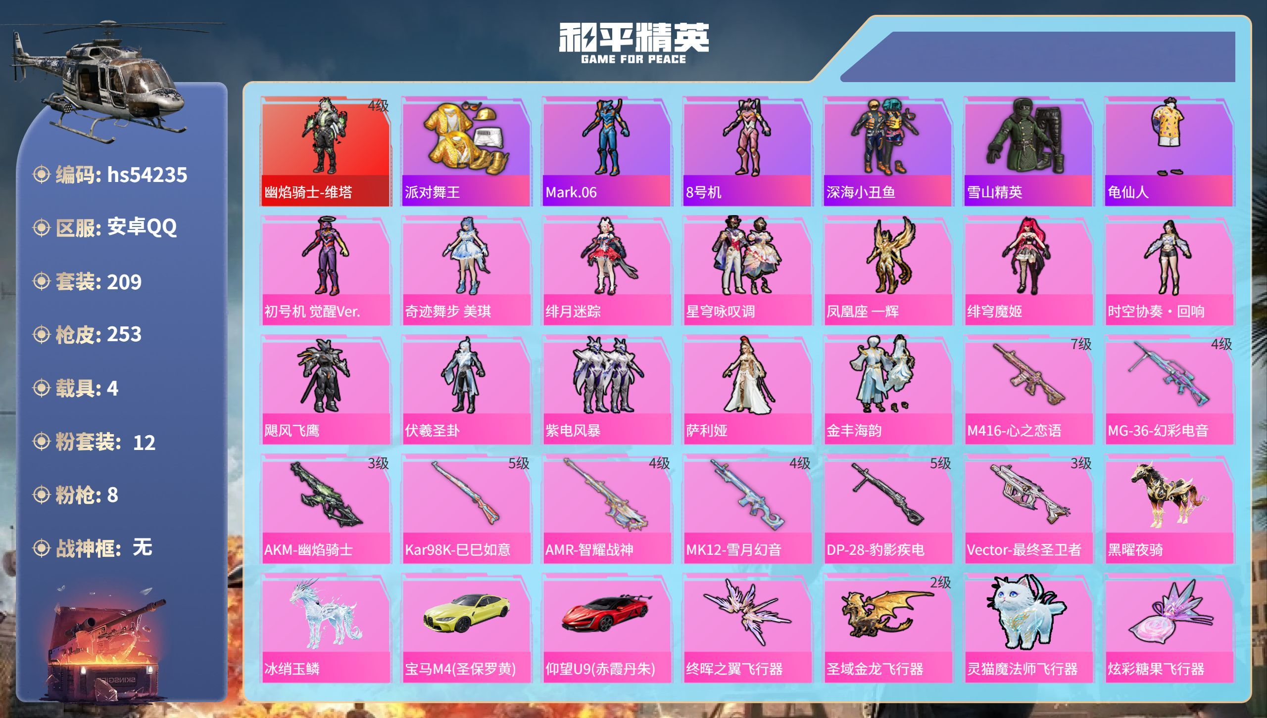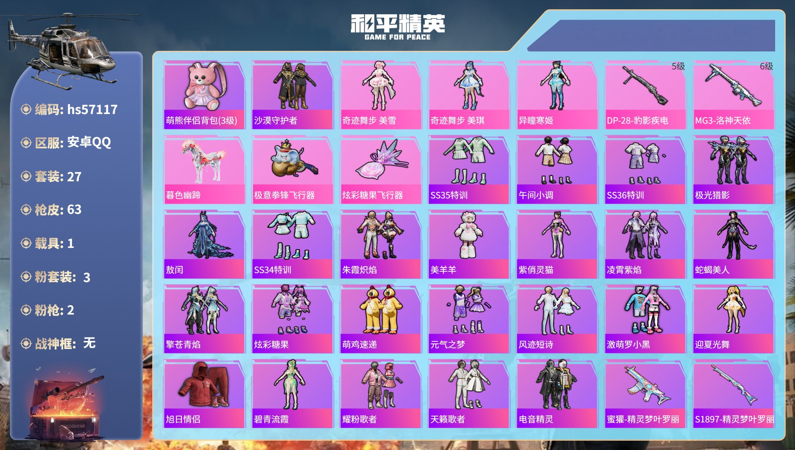 hs57117 安卓手Q-1王牌印记-3粉装-2特效枪-1载具-17606热力值-27套装-63枪皮