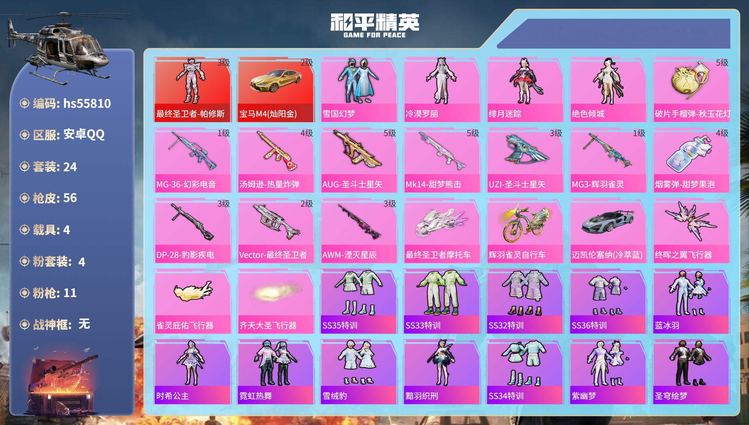 hs55810 安卓手Q-1王牌印记-1红装-4粉装-11特效枪-4载具-27773热力值-24套装