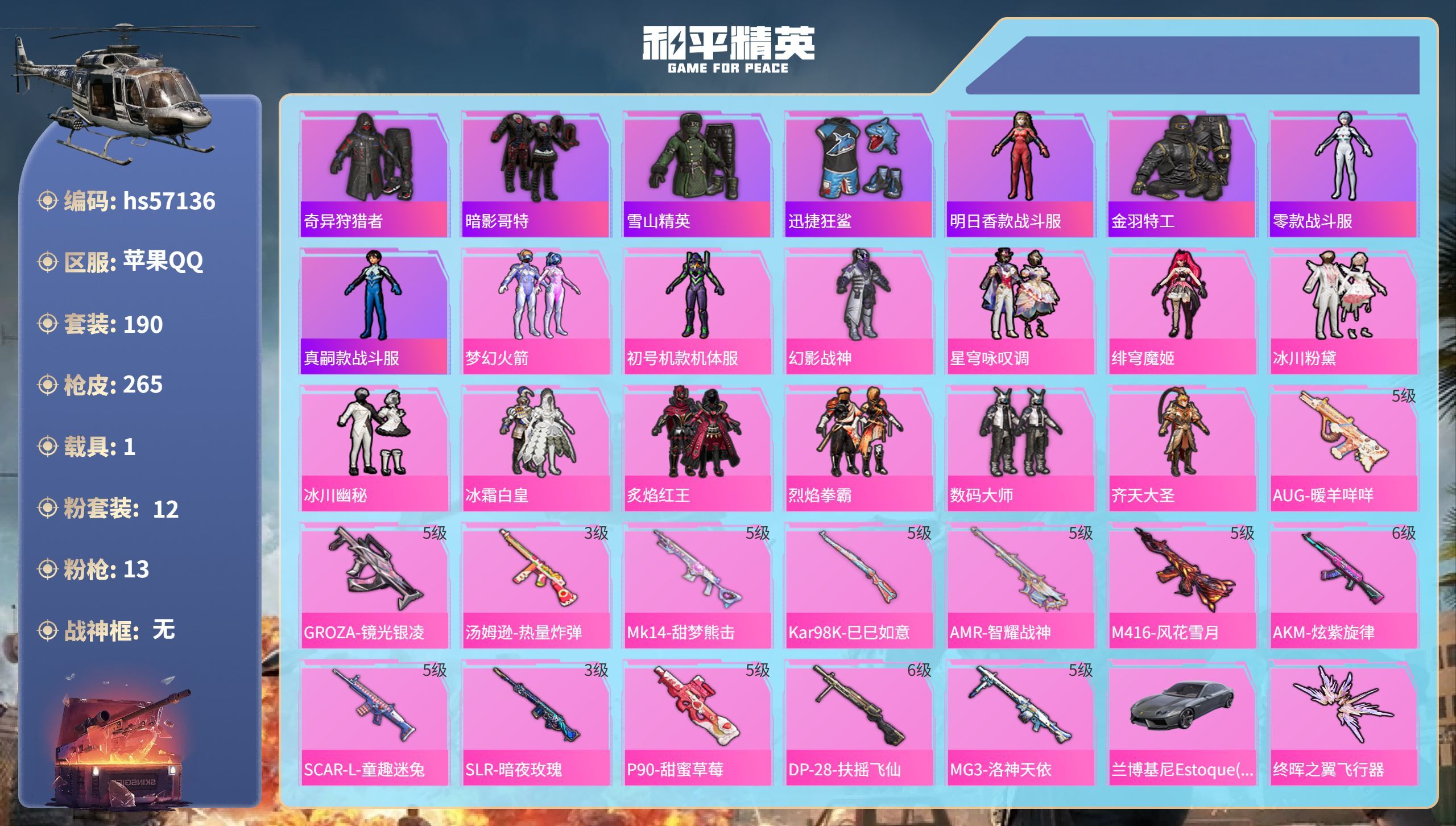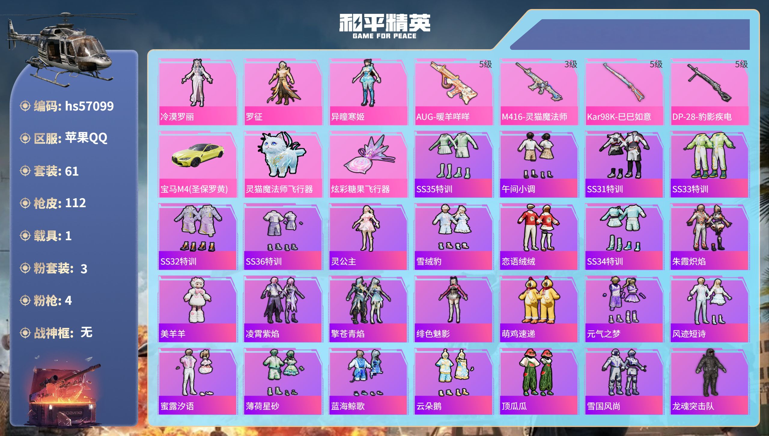 hs57099 苹果手Q-3王牌印记-3粉装-4特效枪-1载具-30616热力值-61套装-112枪