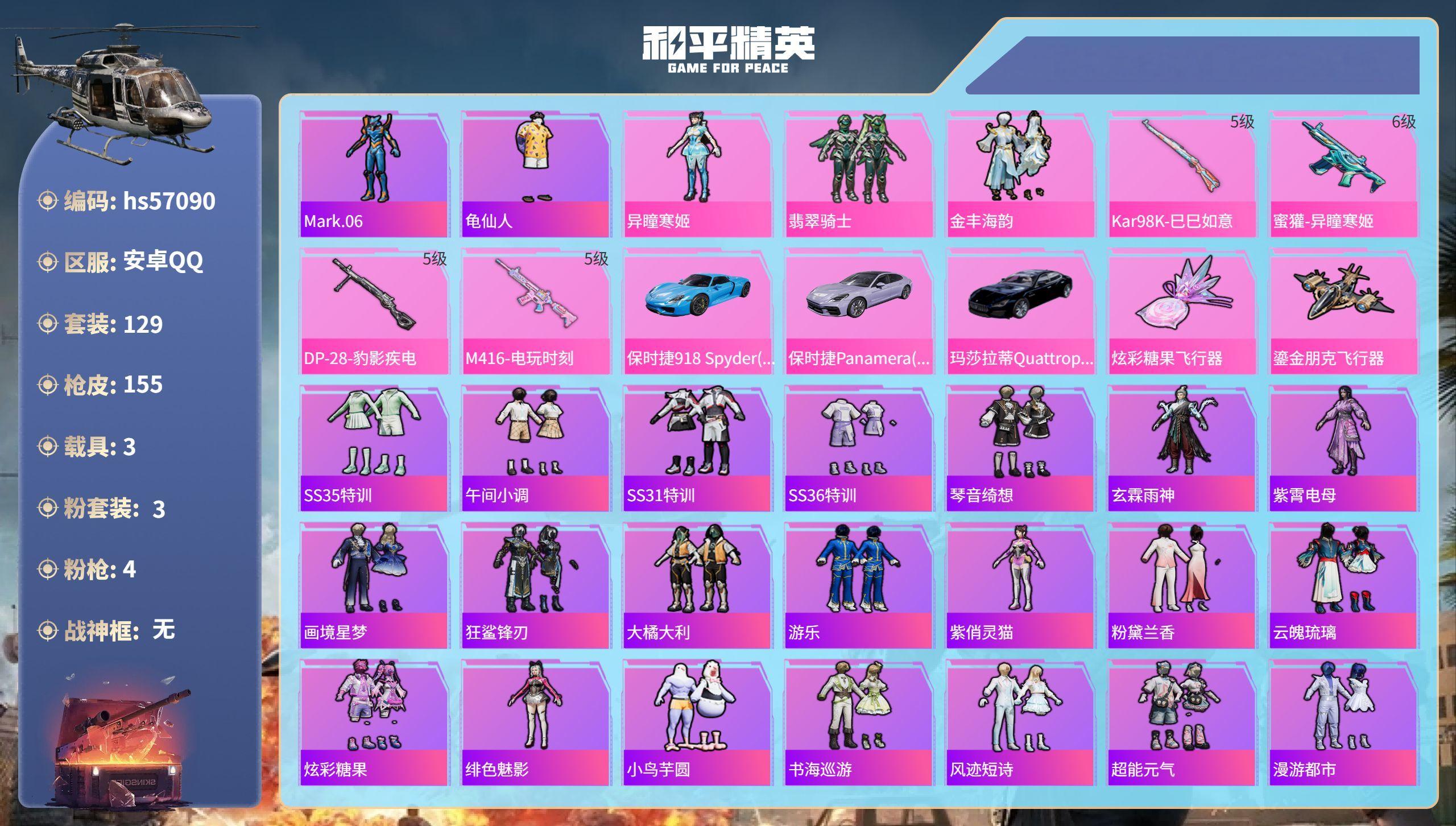 hs57090 安卓手Q-4王牌印记-3粉装-4特效枪-3载具-51777热力值-129套装-155