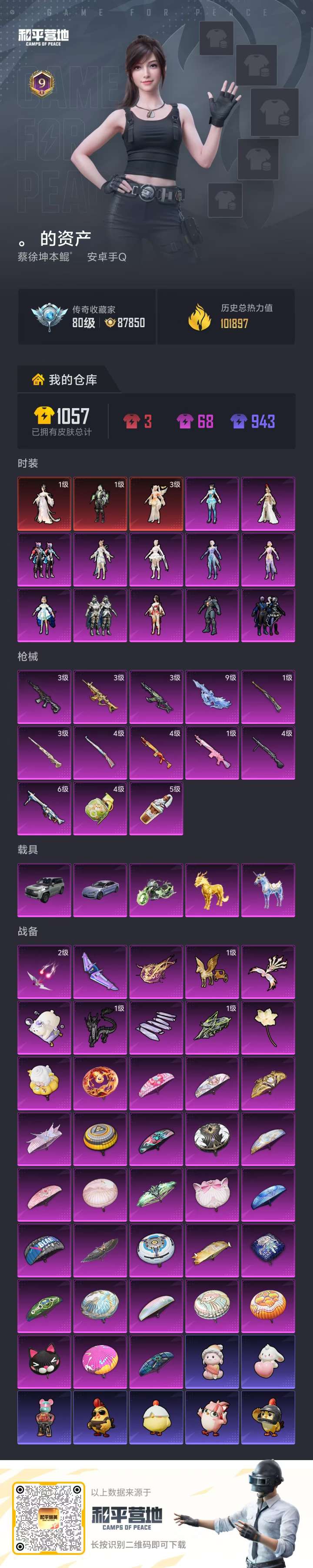 实名: 可修改 时装数: 364 枪械数: 110 战备数: 89 热门装扮: