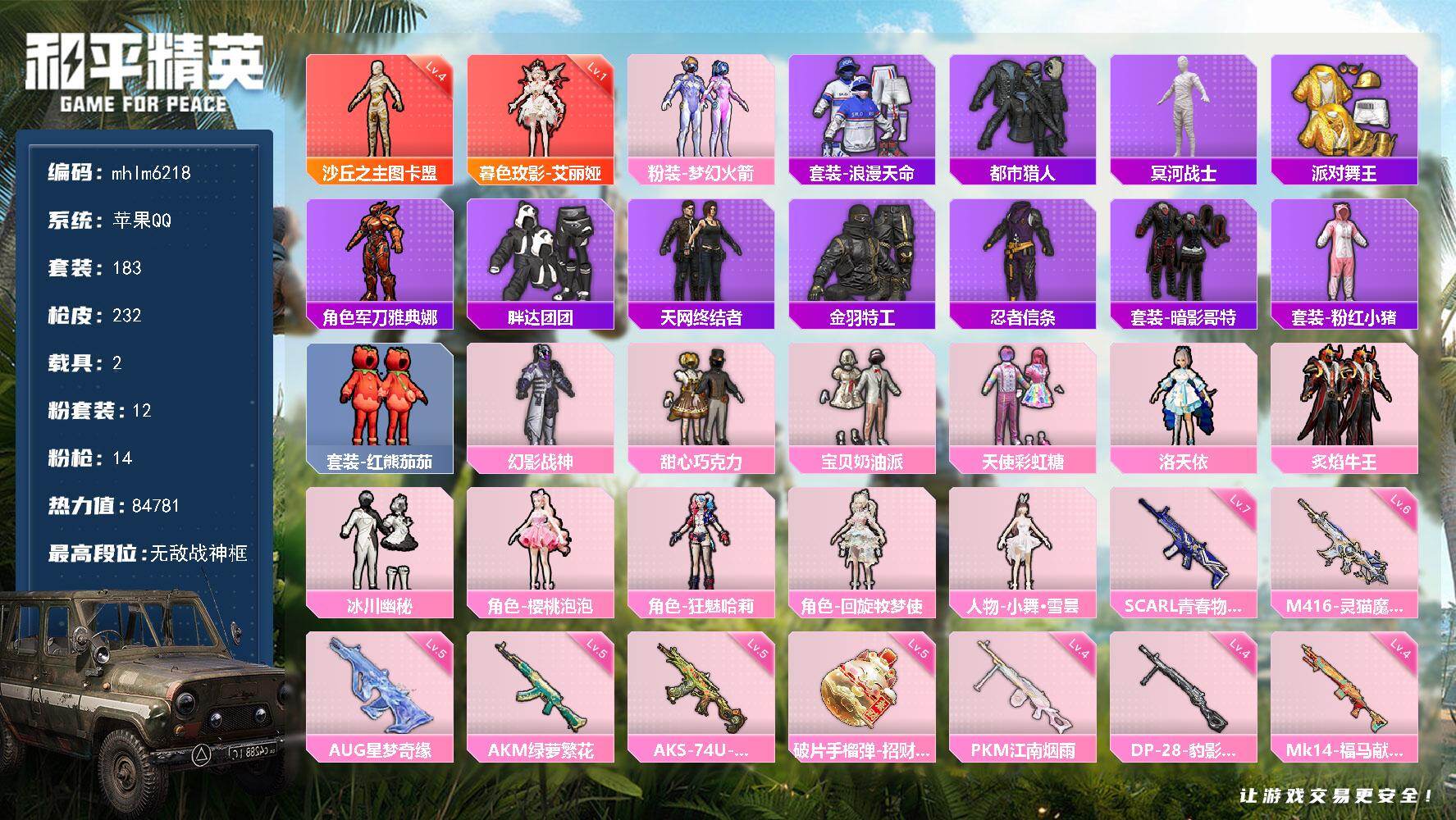 【mhlm6203】安卓 手Q-1神装-18粉装-15特效枪-2载具-4粉色飞
