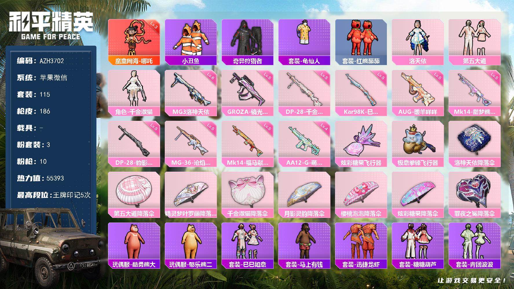 八套粉装,12把升级枪,一个升级飞行器,一辆载具,精氪号,王者贵五连体