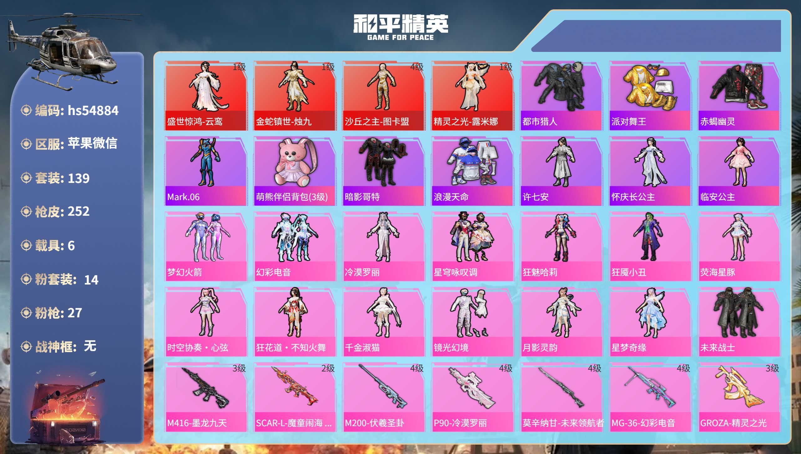 hs54884 苹果v-6王牌印记-4红装-14粉装-27特效枪-6载具-100867热力值-13
