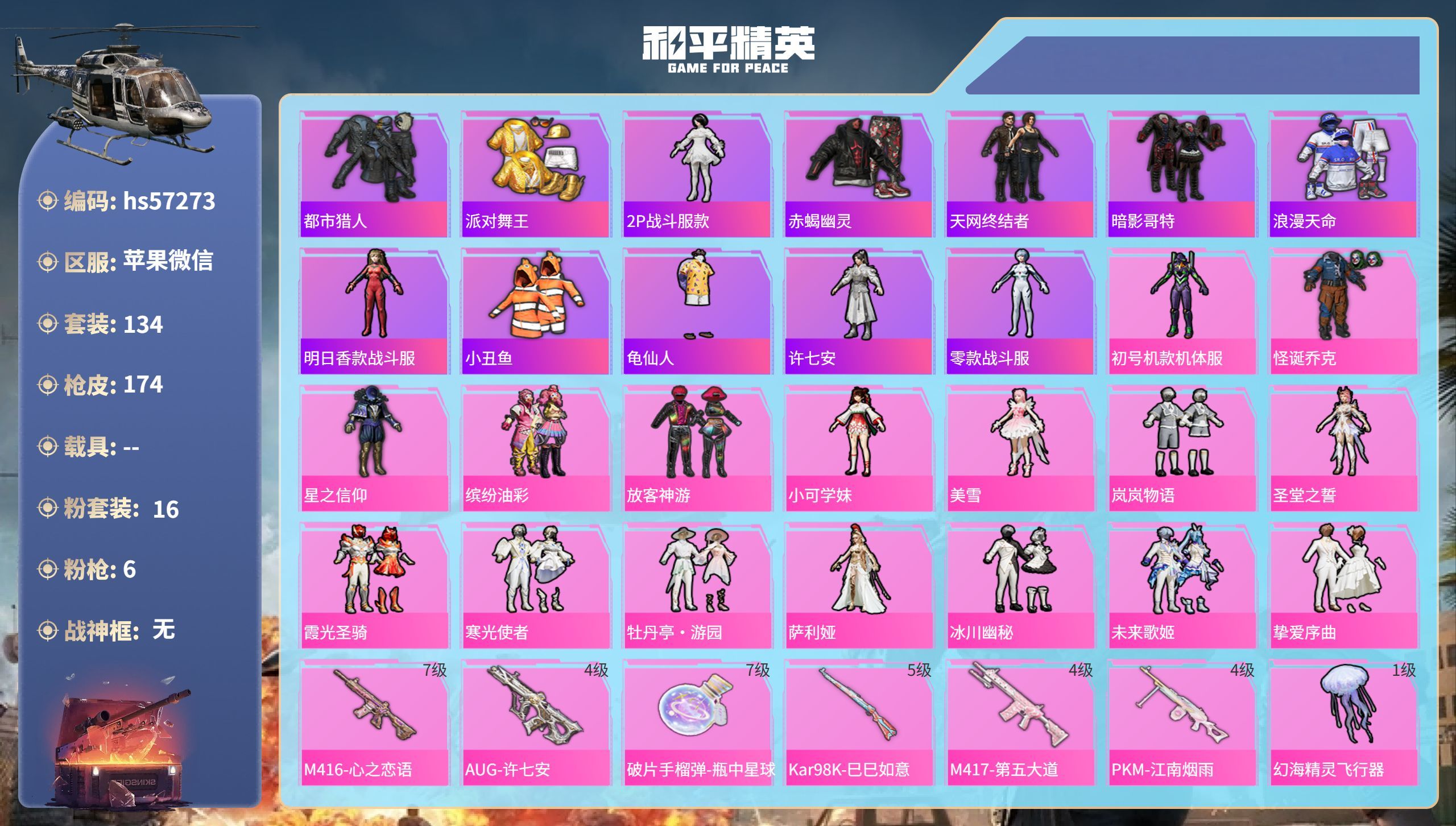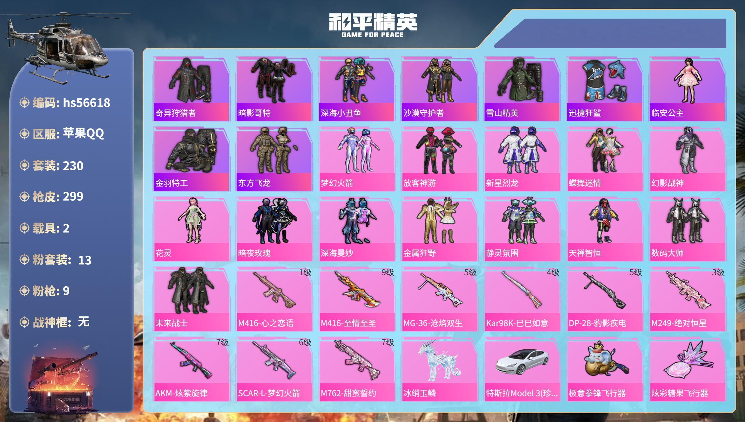 hs56618苹果手Q-26王牌印记-13粉装-9特效枪-2载具-106097热力值-230套装-2
