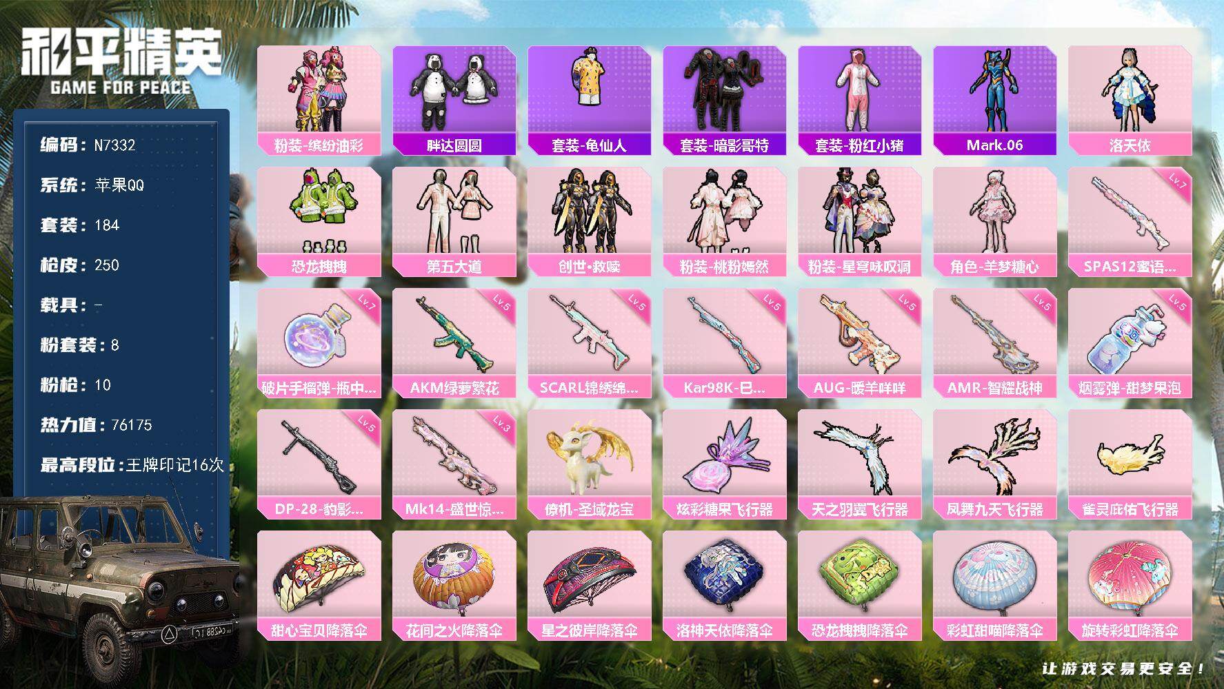 苹果 手Q-8粉装-10特效枪-0载具-4粉色飞行器-76175热力值-16王牌