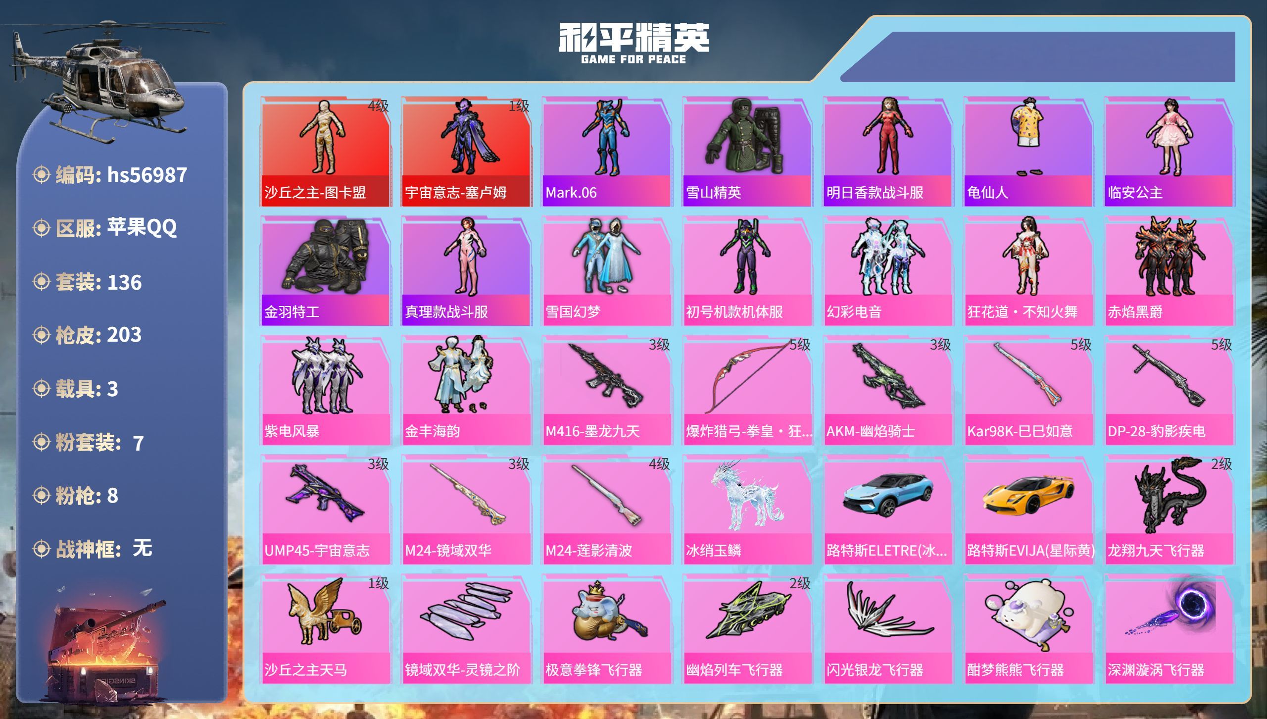 hs56987 苹果手Q-10王牌印记-2红装-7粉装-8特效枪-3载具-75864热力值-136套