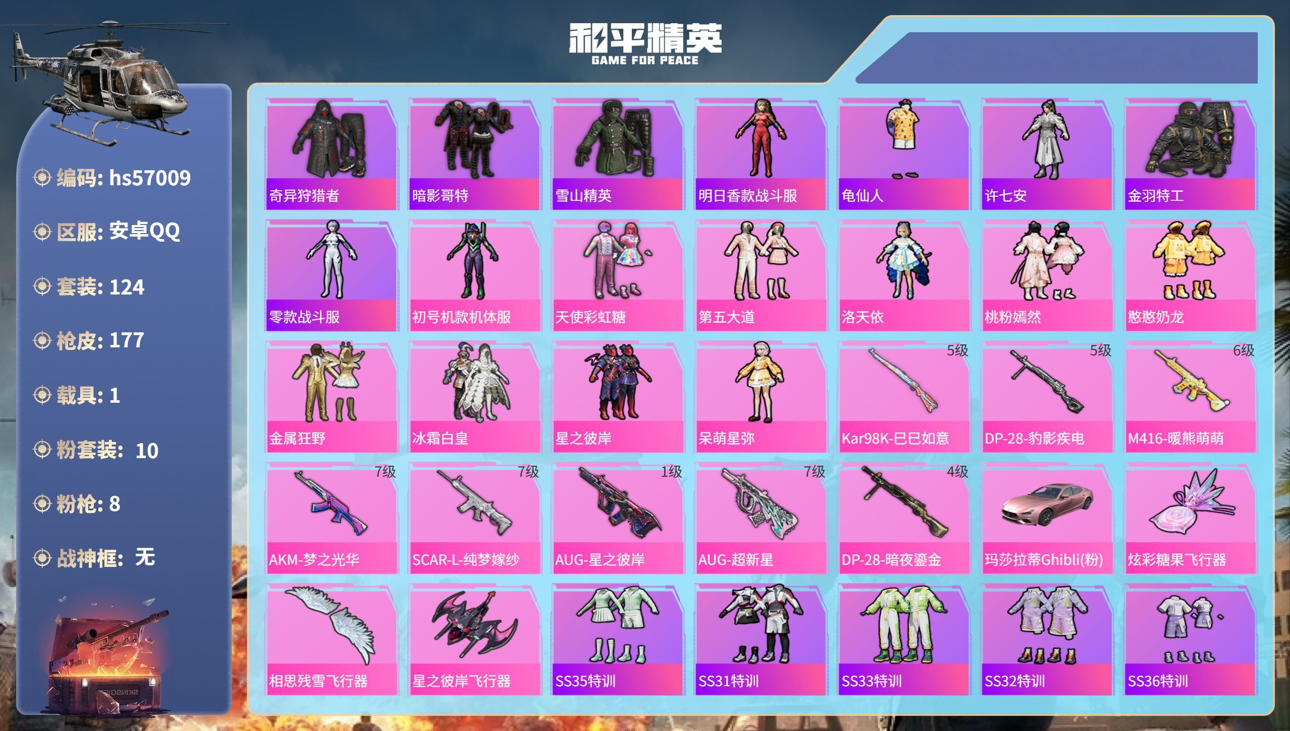 hs57009 安卓手Q-18王牌印记-10粉装-8特效枪-1载具-64423热力值-124套装-1