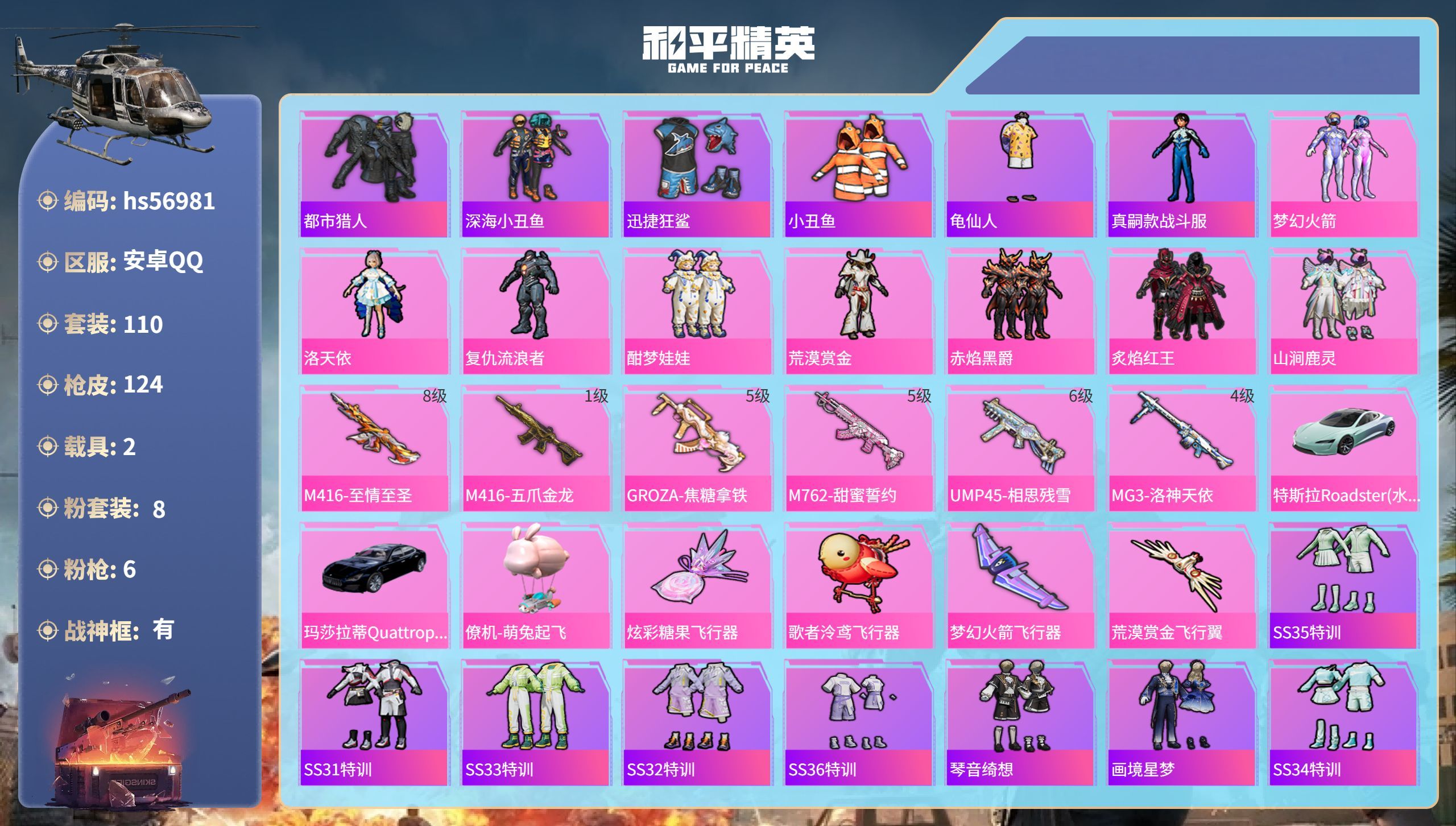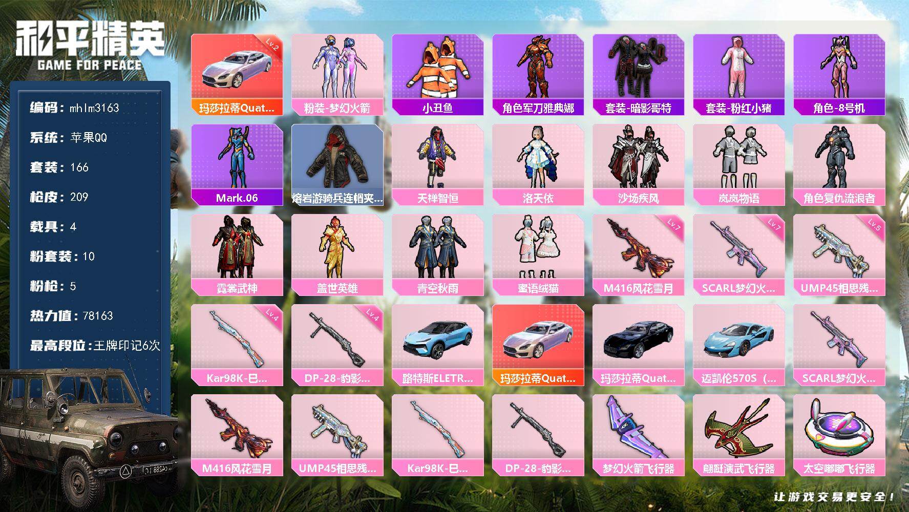 hs52929安卓手Q-2王牌印记-1粉装-4特效枪-3载具-16397热力值-23套装-45枪皮【