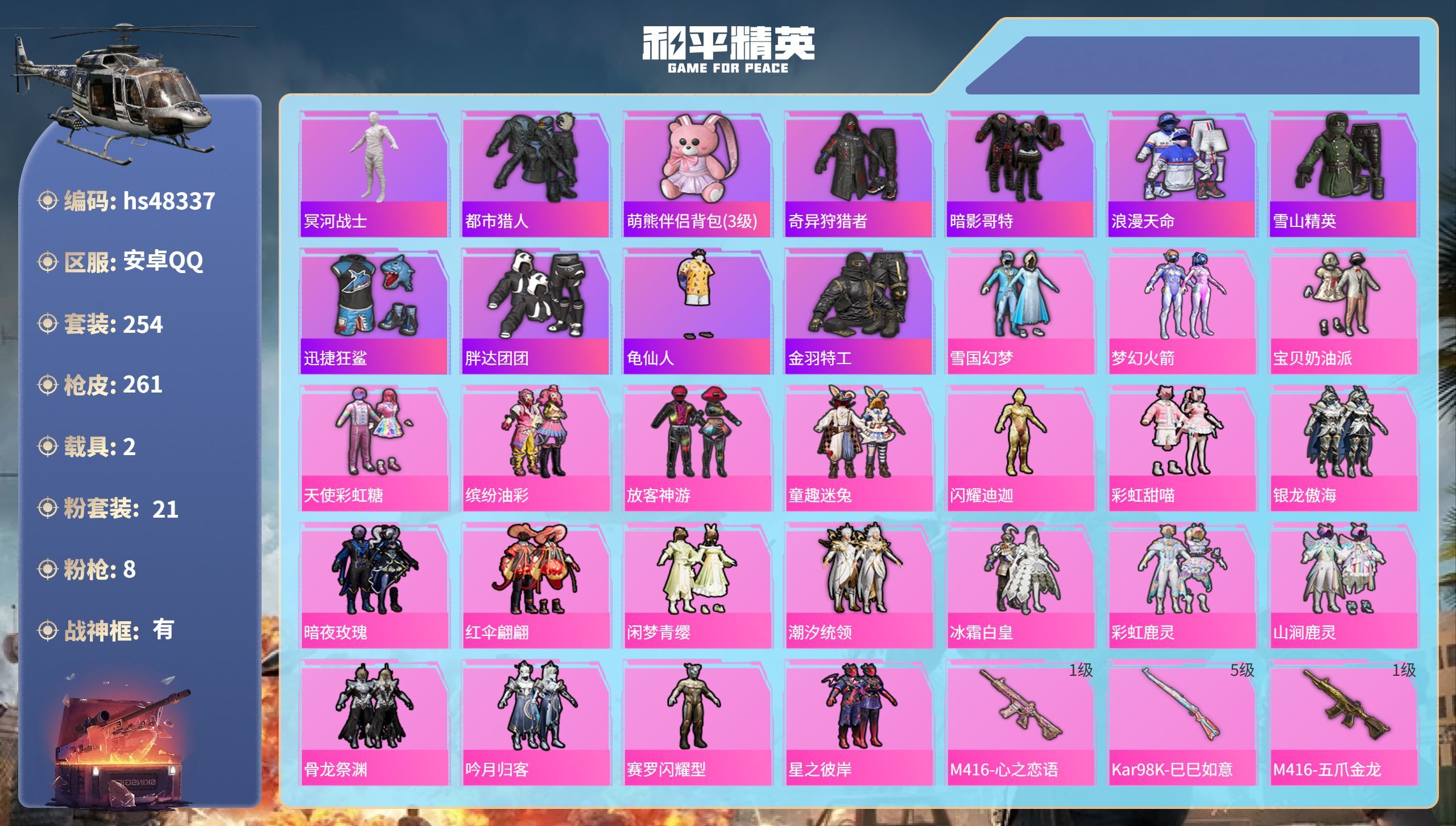 hs48337 安卓手Q-20王牌印记-有战神框-21粉装-8特效枪-2载具-100515热力值-2