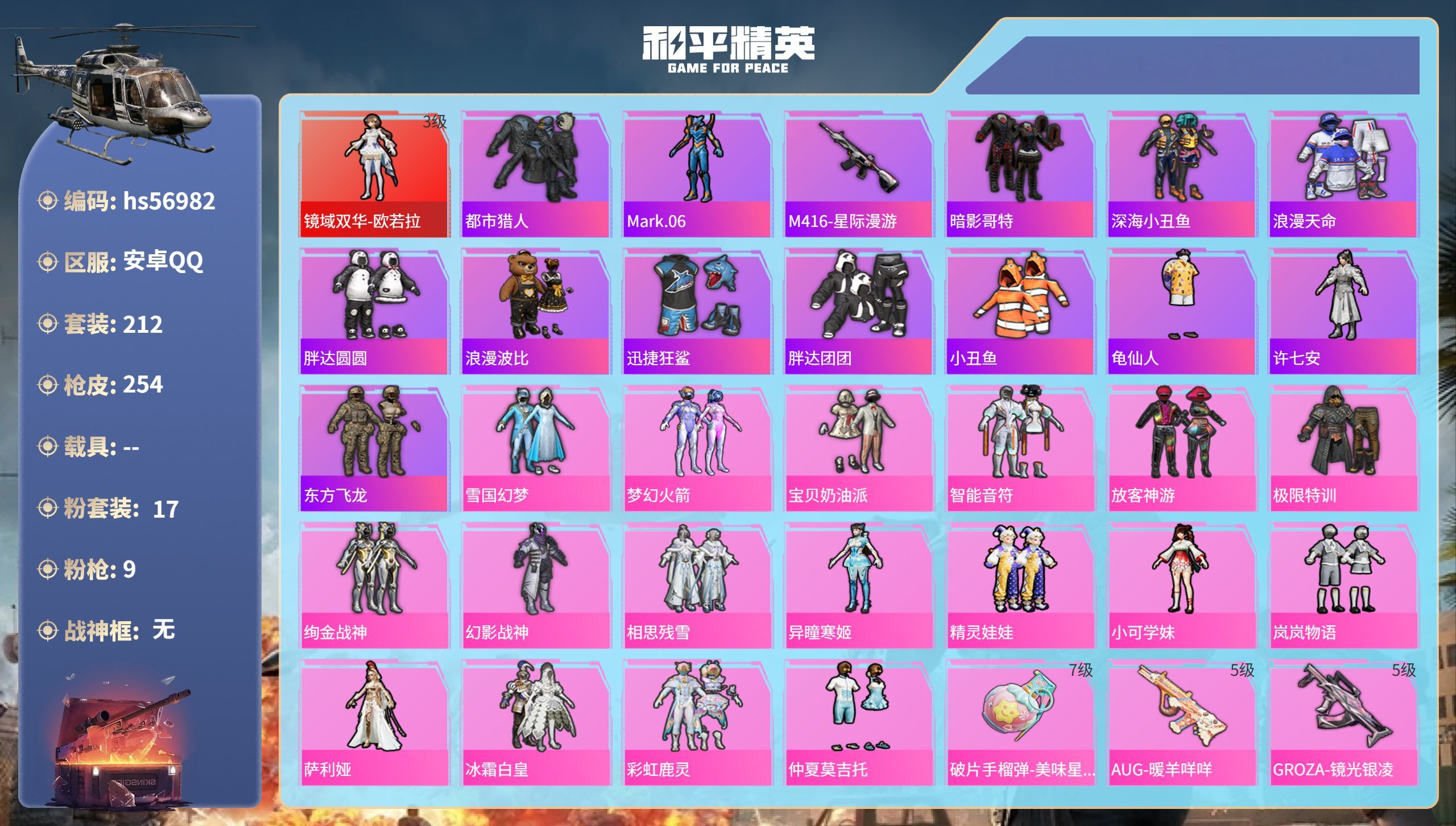 hs56982 安卓手Q-16王牌印记-1红装-17粉装-9特效枪-88554热力值-212套装-2