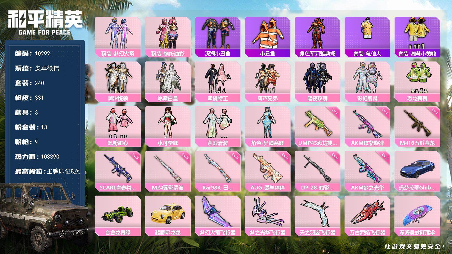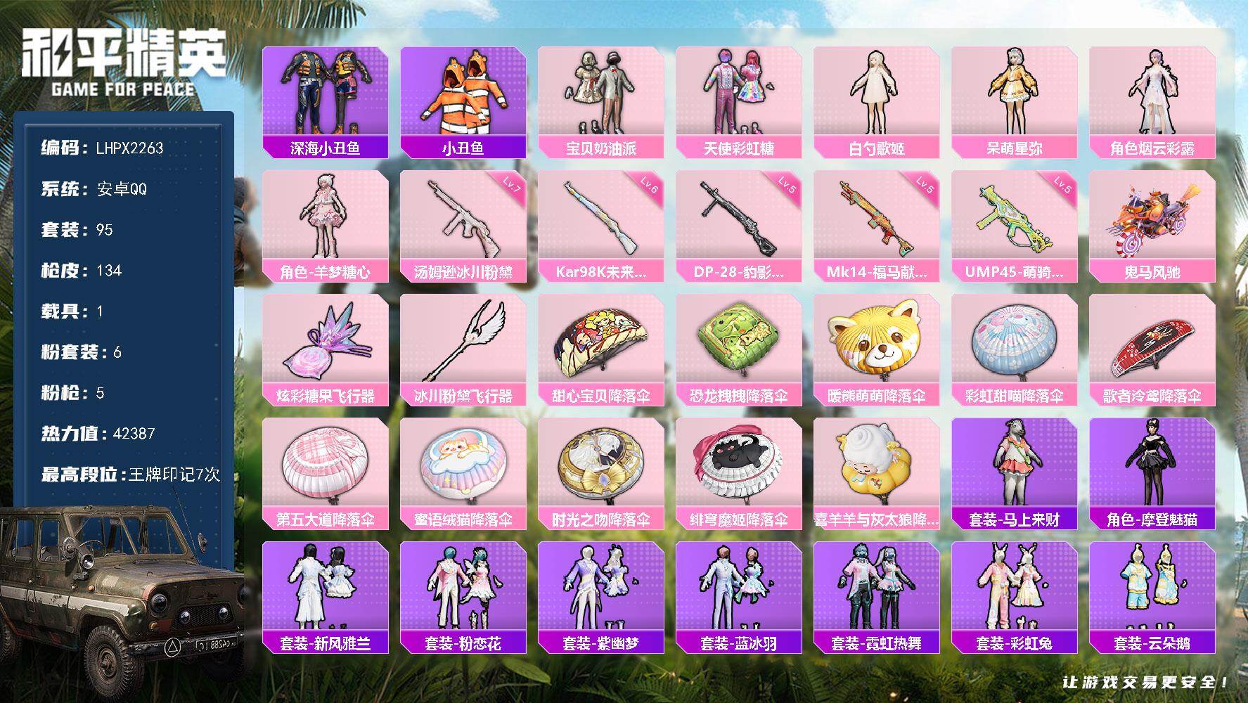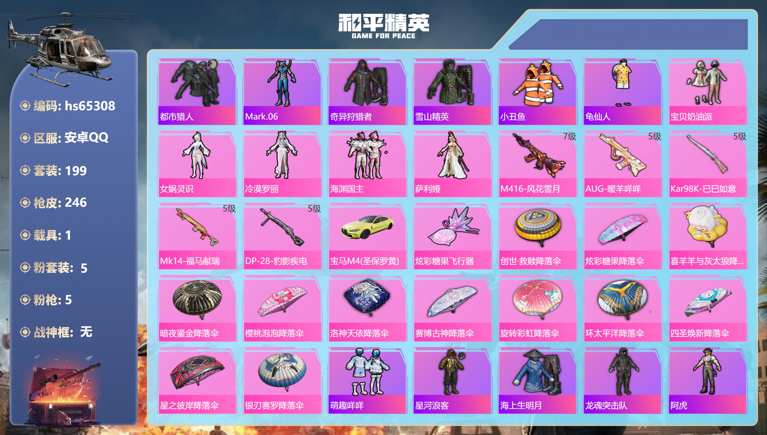 安卓手Q-2粉装-5特效枪-94套装-172枪皮-4王牌印记-超级王牌6星-41