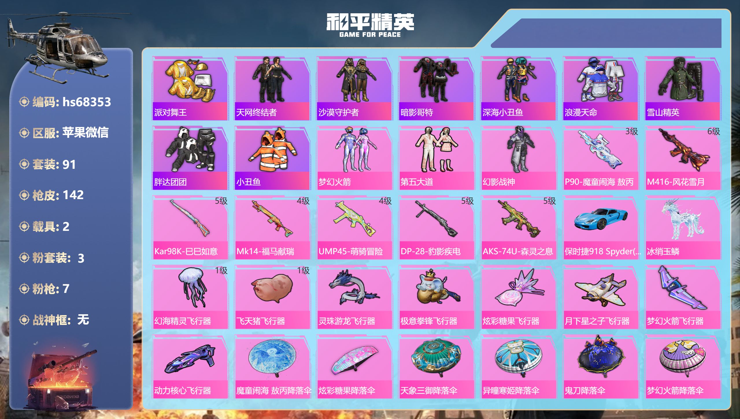 苹果 微信-8粉装-12特效枪-2载具-8粉色飞行器-81009热力值-12王