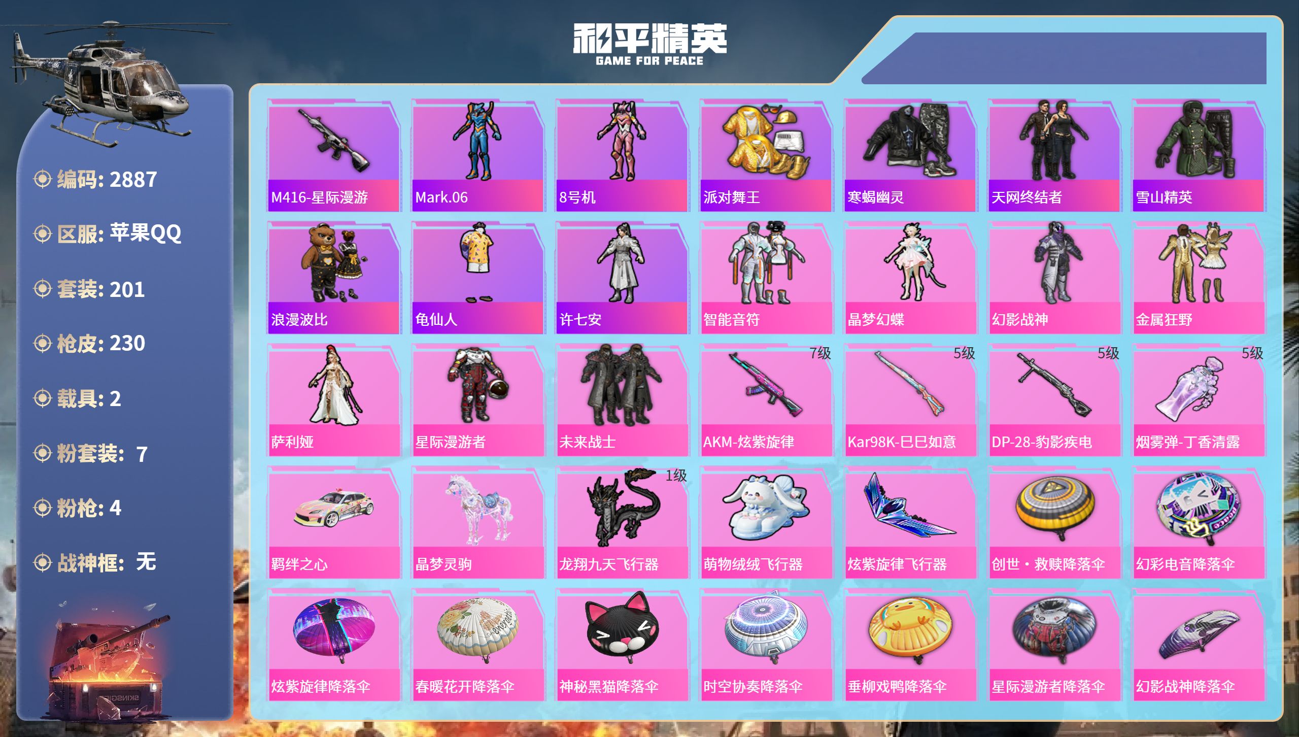 苹果手Q-10王牌印记-12粉装-14特效枪-1载具-热力值-2