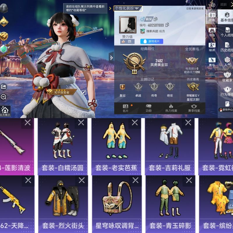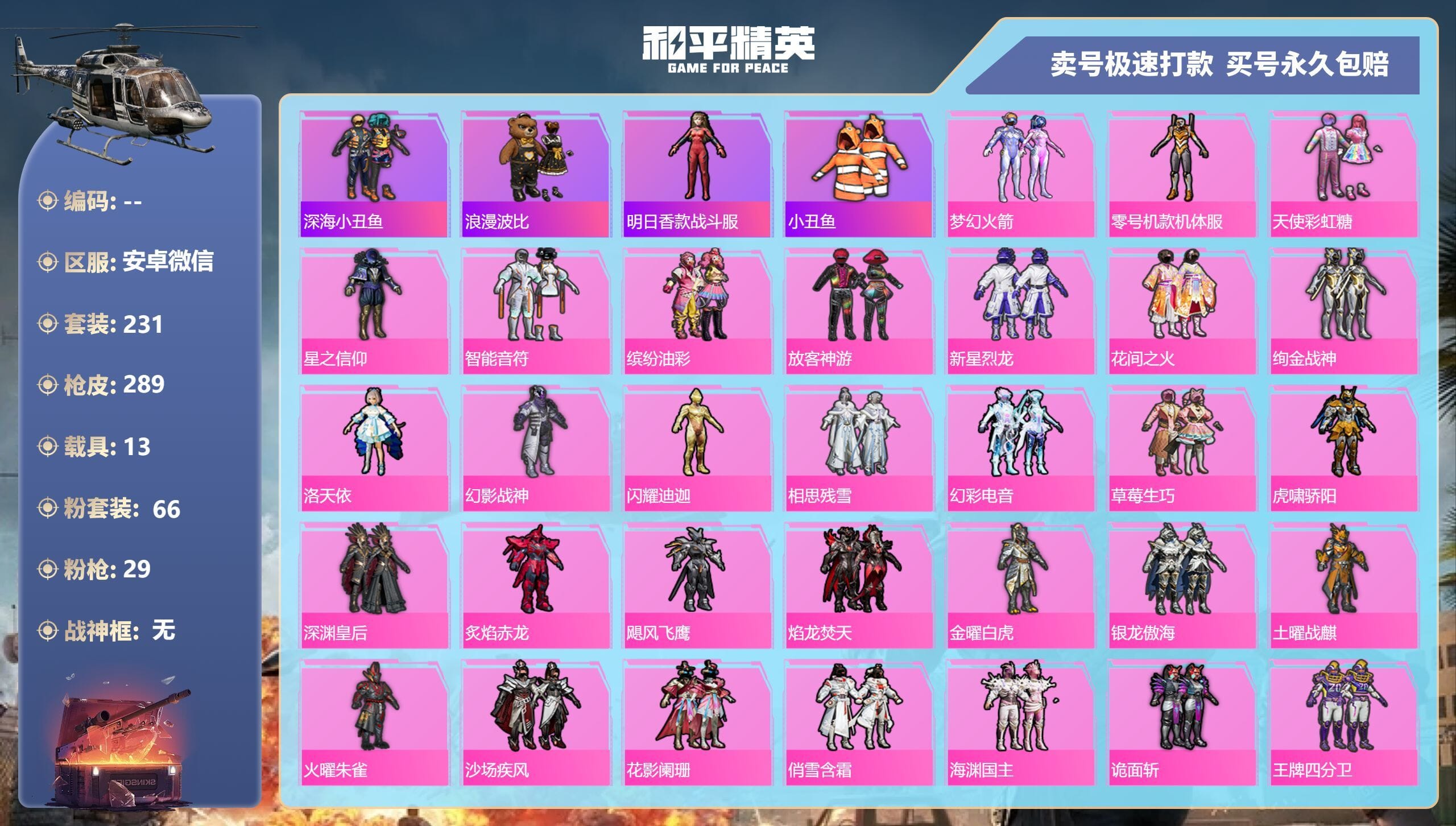 安卓v-10王牌印记-66粉装-29特效枪-13载具-150157热力值-231套装-289枪皮-