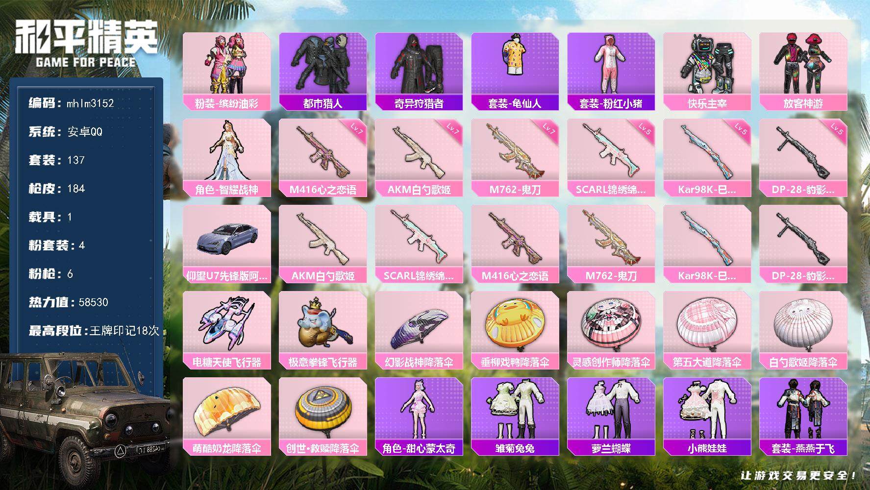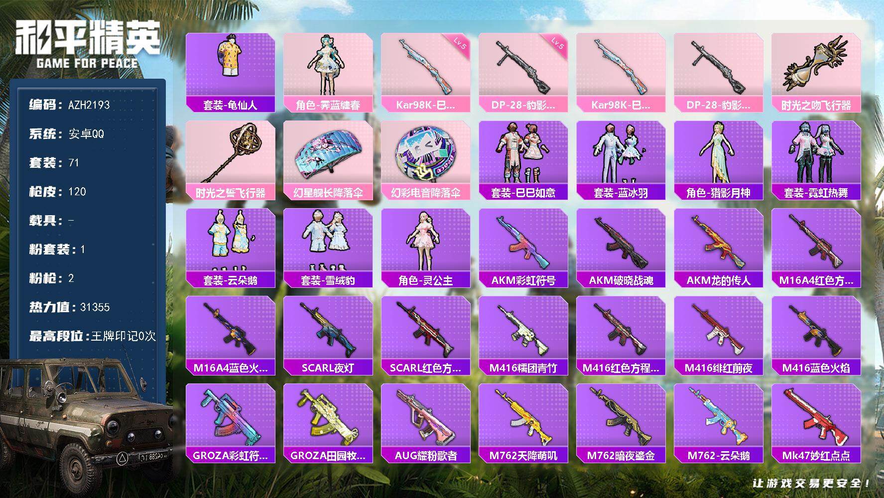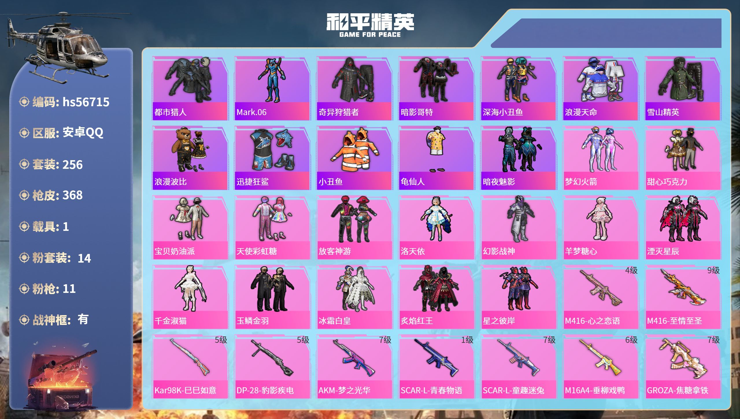 hs56715安卓手Q-20王牌印记-有战神框-14粉装-11特效枪-1载具-118405热力值-2