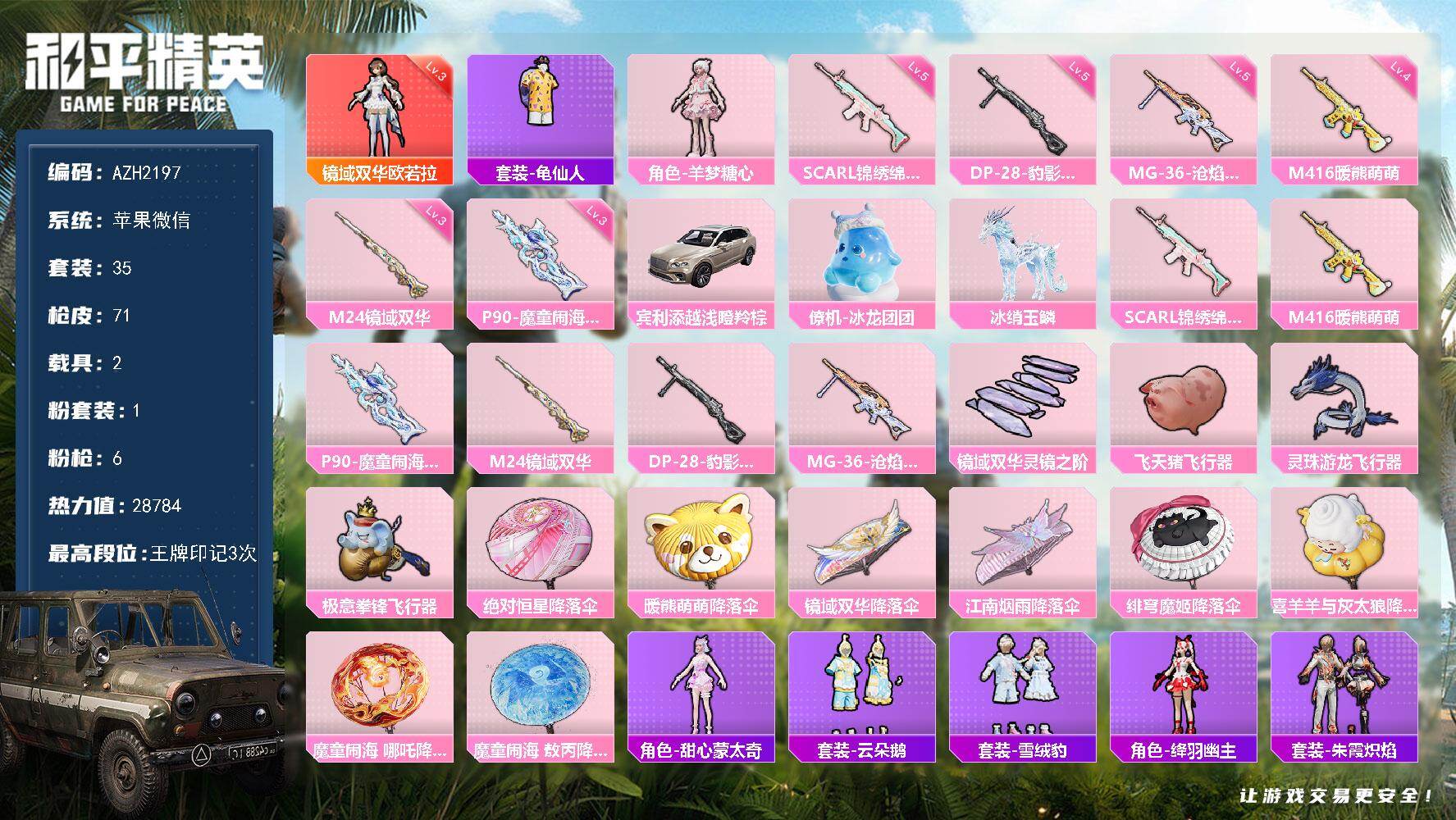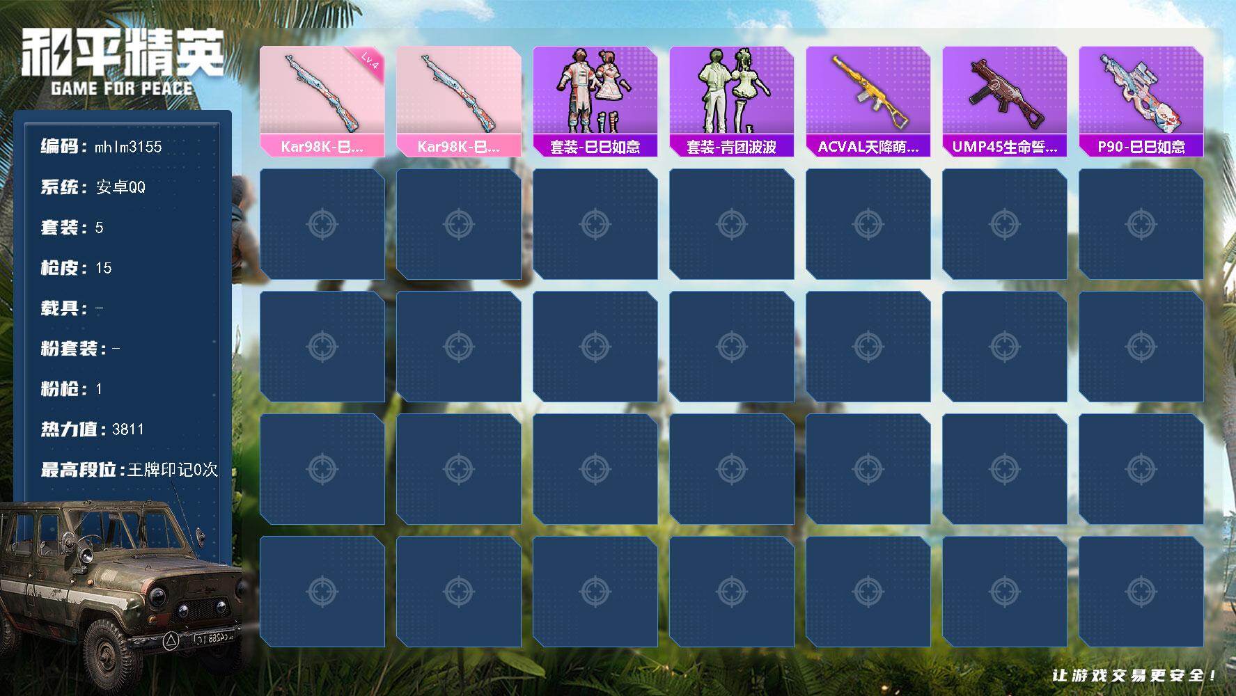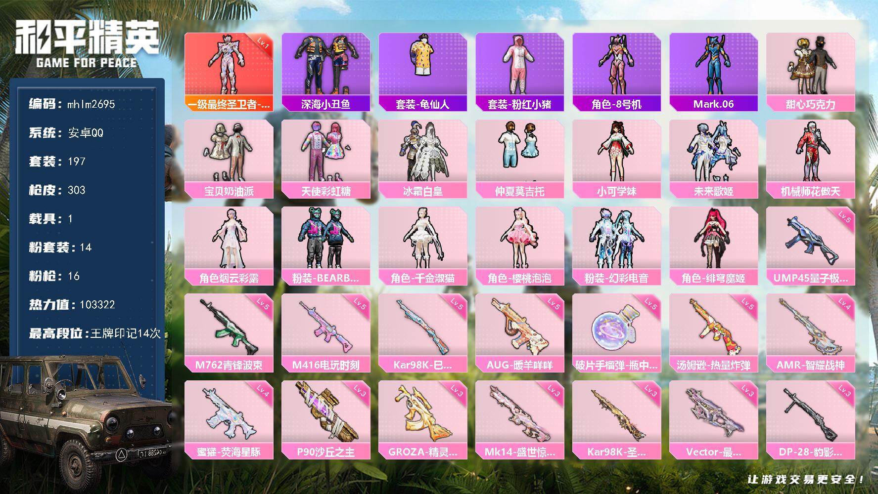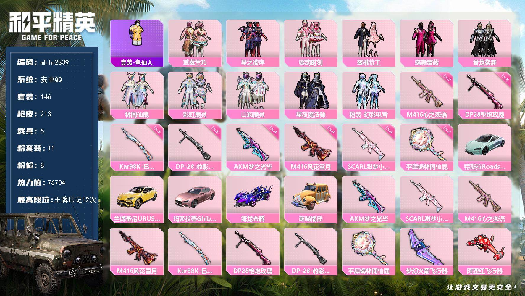 hs56715安卓手Q-20王牌印记-有战神框-14粉装-11特效枪-1载具-118405热力值-2