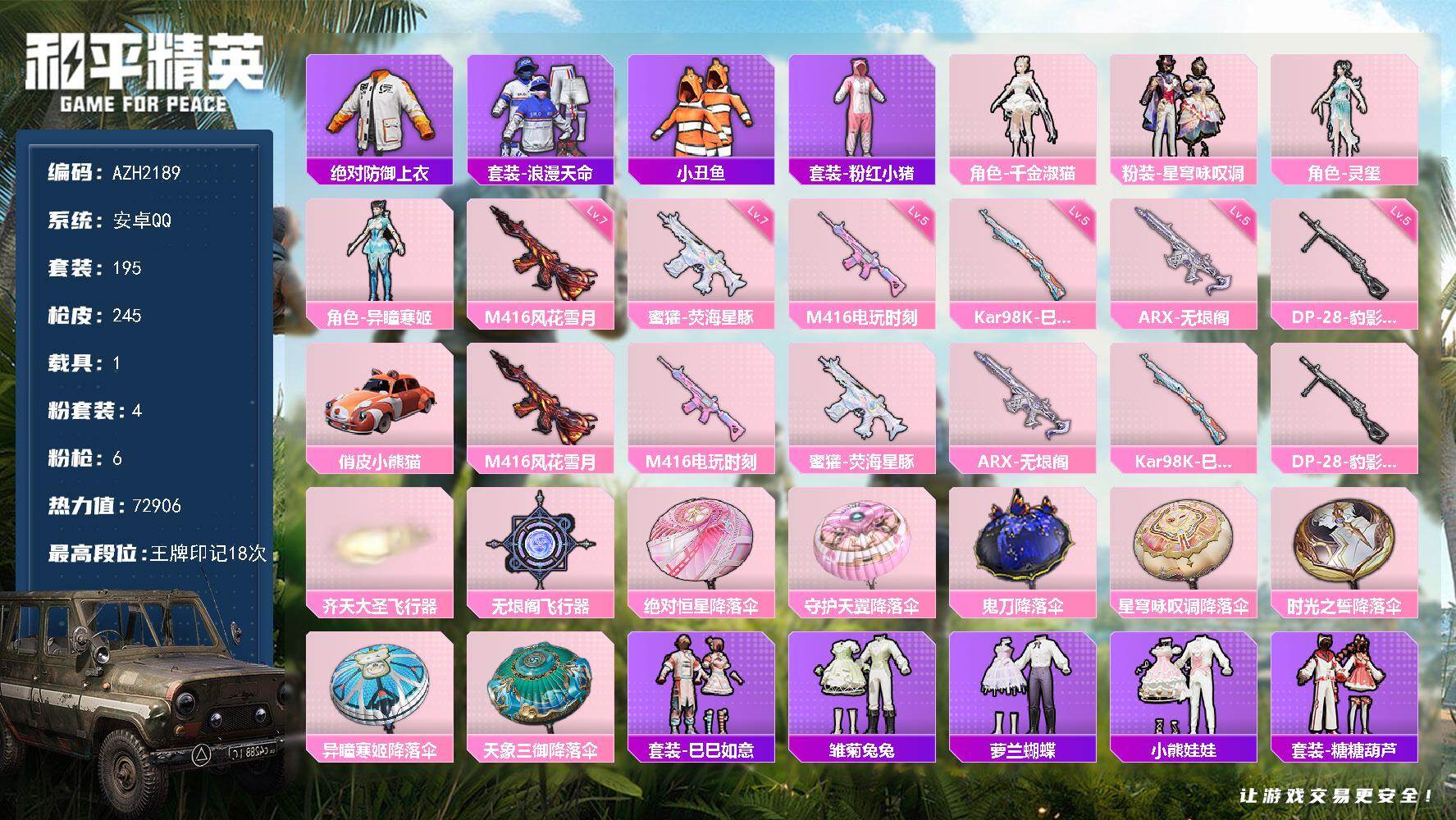 【AZH2189】安卓 手Q【18印记 巡查衣千金淑猫小丑鱼 满级风花雪月M4