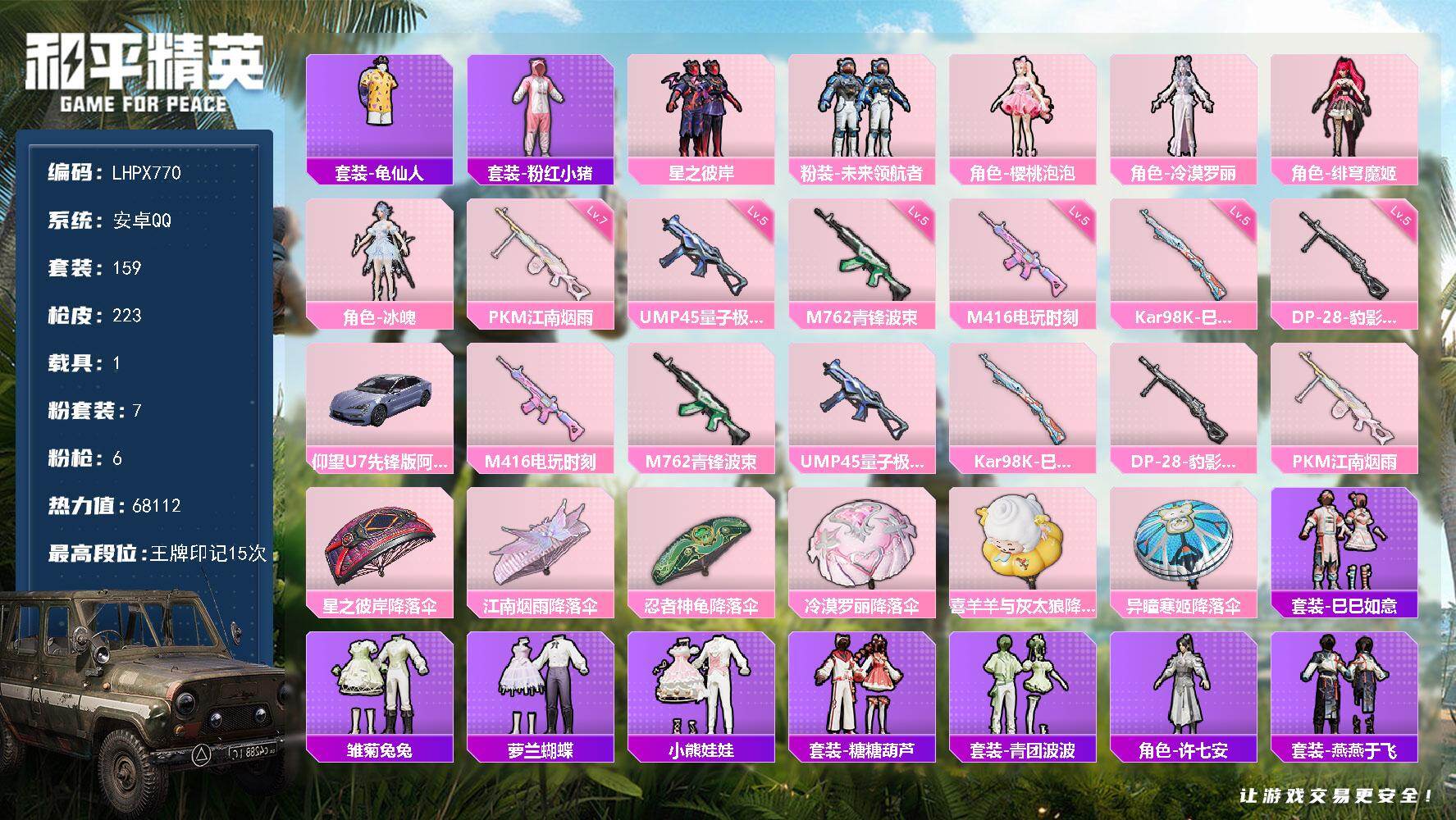 7粉装-6特效枪-1载具-1粉色飞行器-68112热力值-15王牌印记-159套装-223枪皮