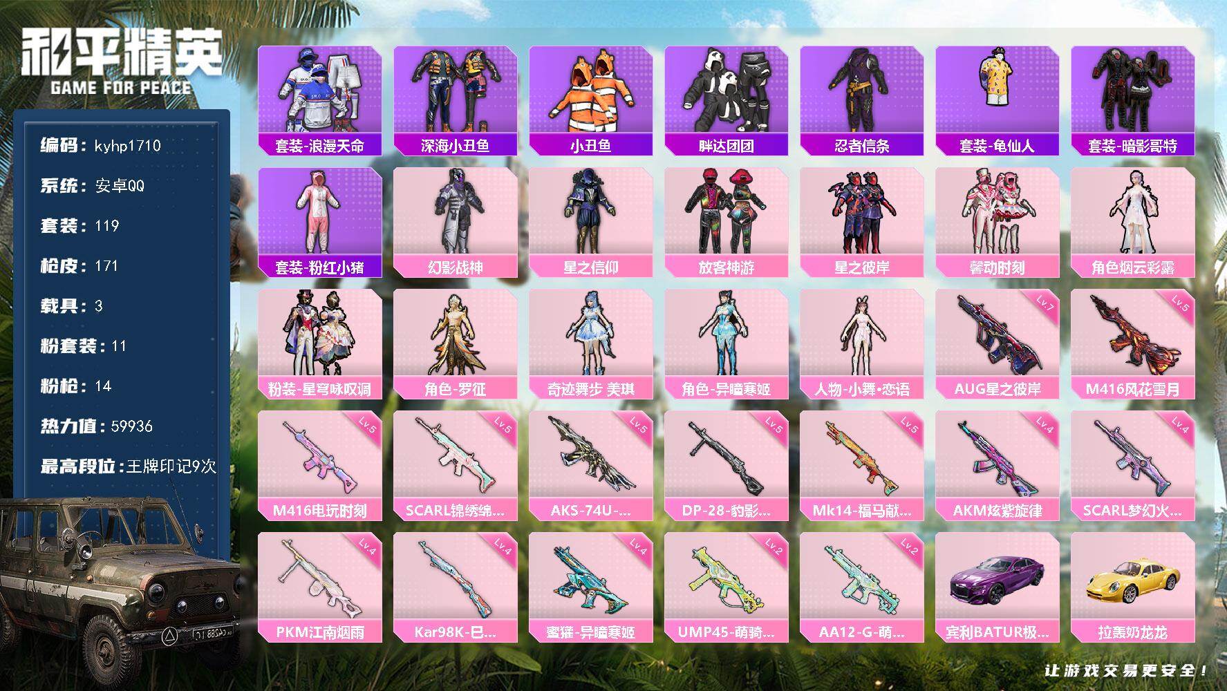 安卓 手Q-11粉装-14特效枪-3载具-7粉色飞行器-59936热力值-9王