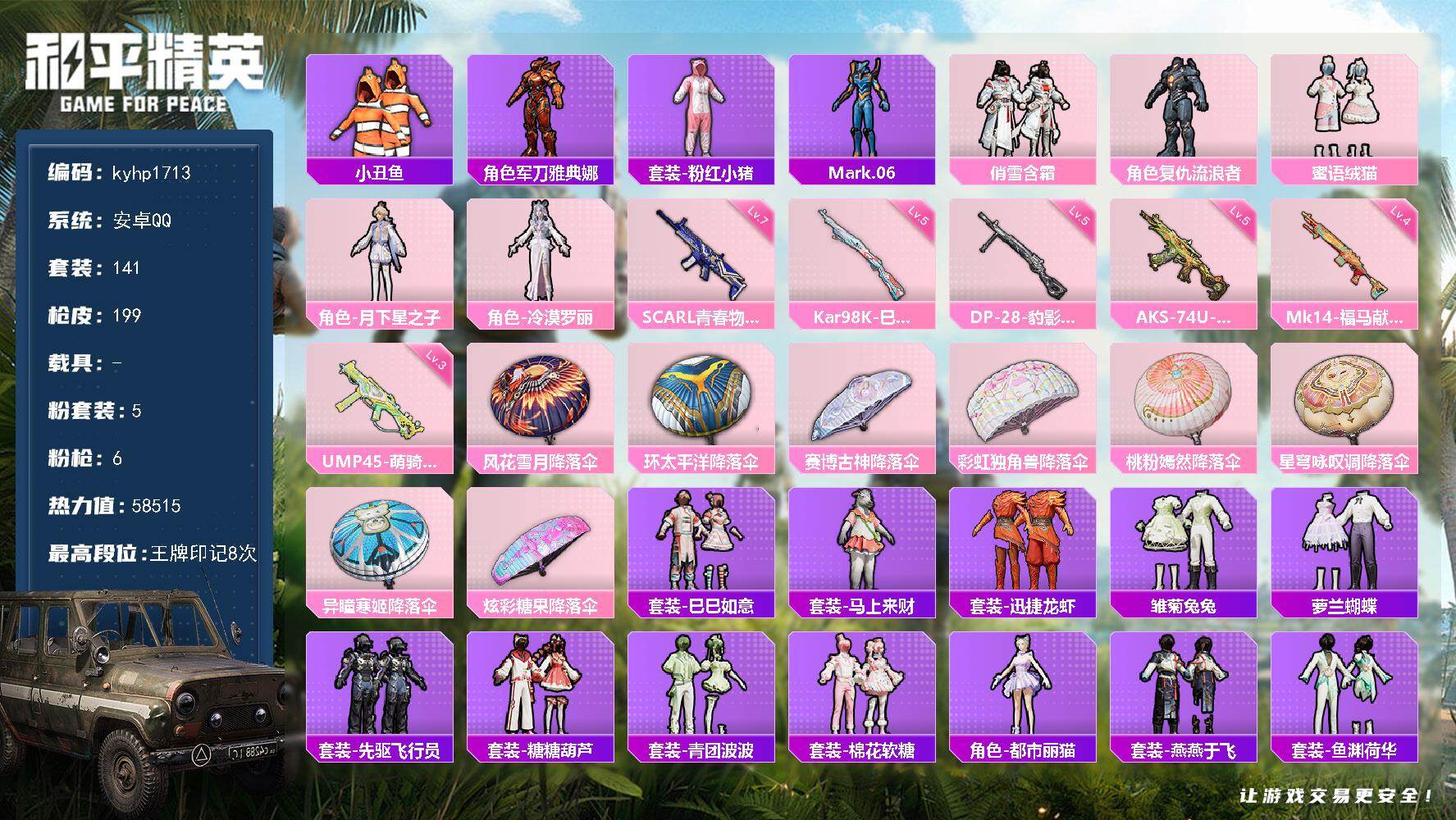 安卓 手Q-5粉装-6特效枪-0载具-0粉色飞行器-58515热力值-8王牌印