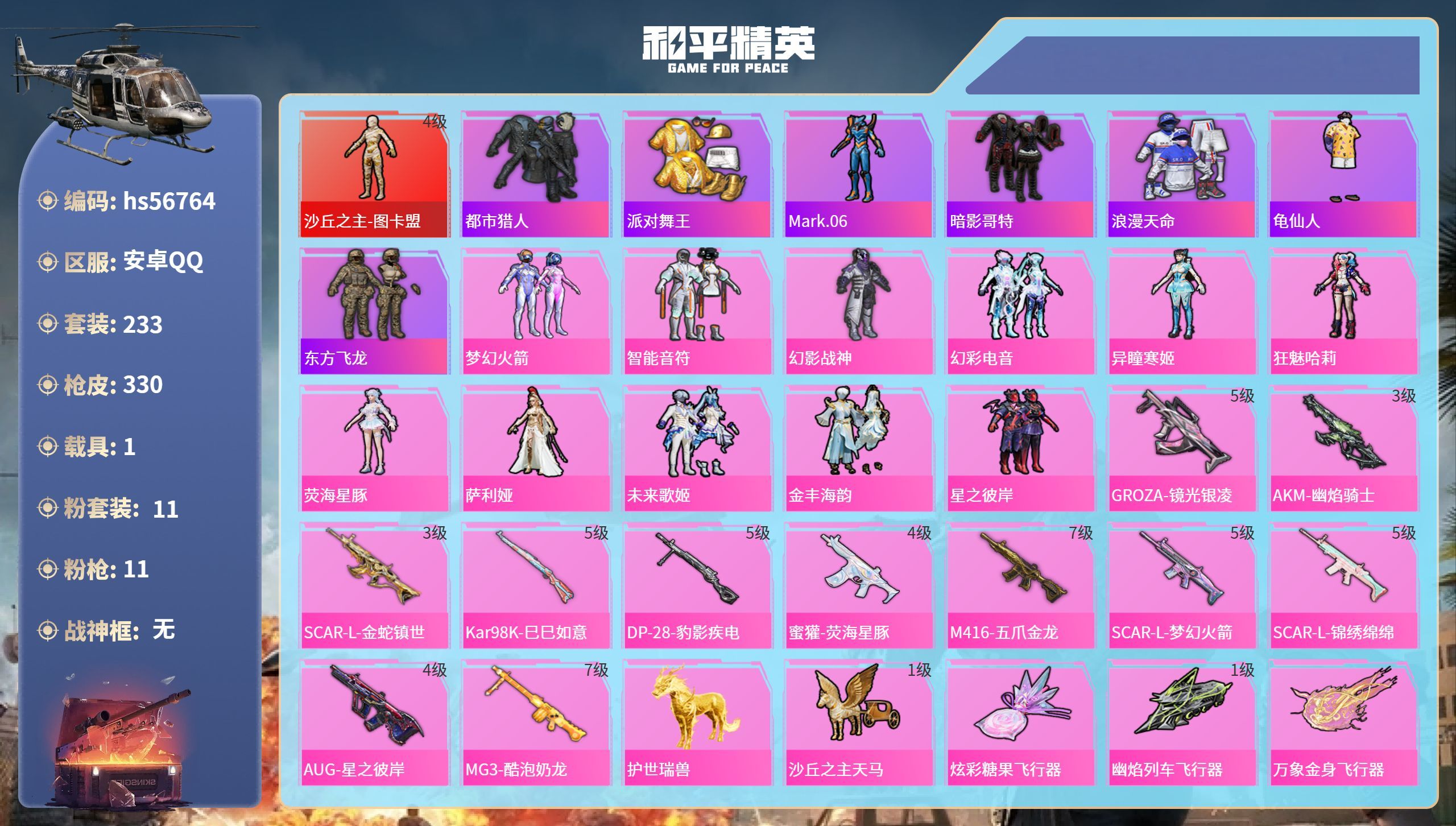 hs56764安卓手Q-18王牌印记-1红装-11粉装-11特效枪-1载具-103866热力值-23