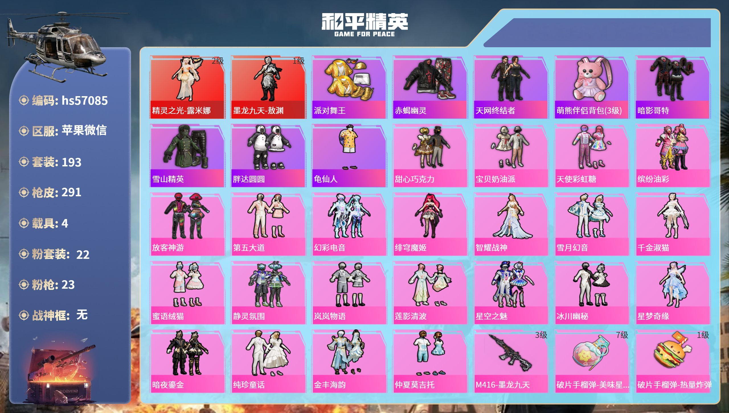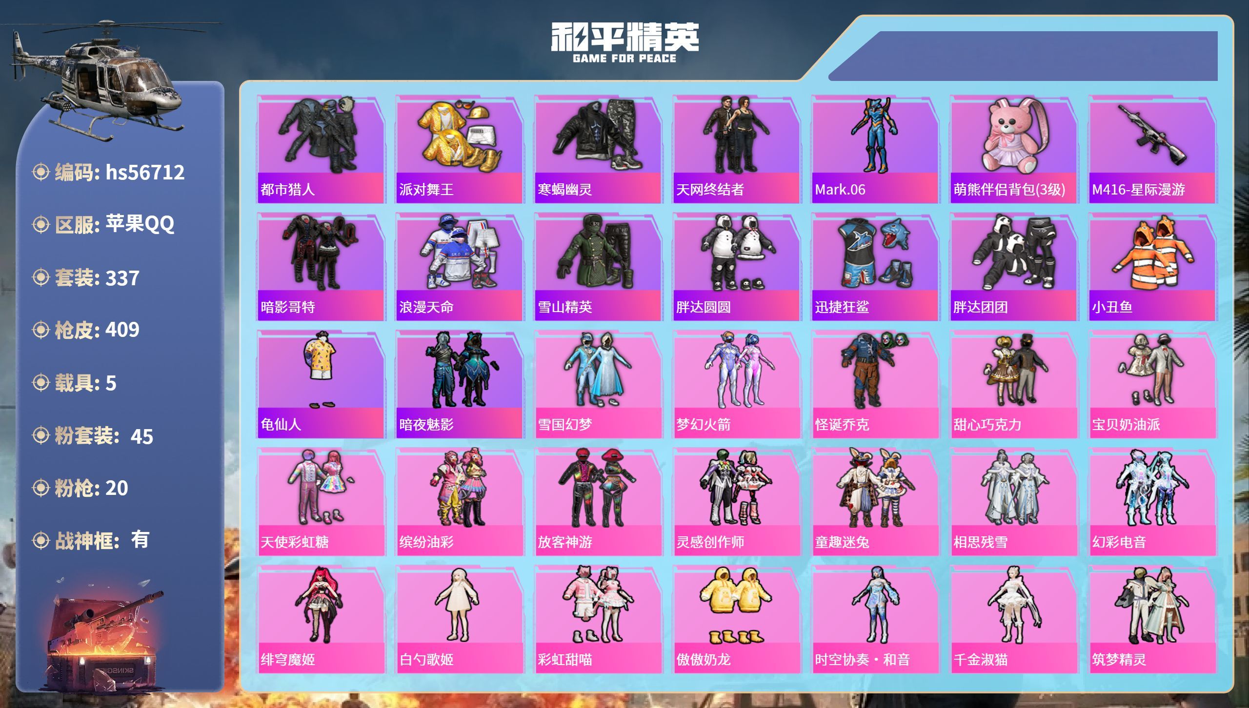 hs56737苹果手Q-12王牌印记-8粉装-7特效枪-2载具-72253热力值-169套装-203