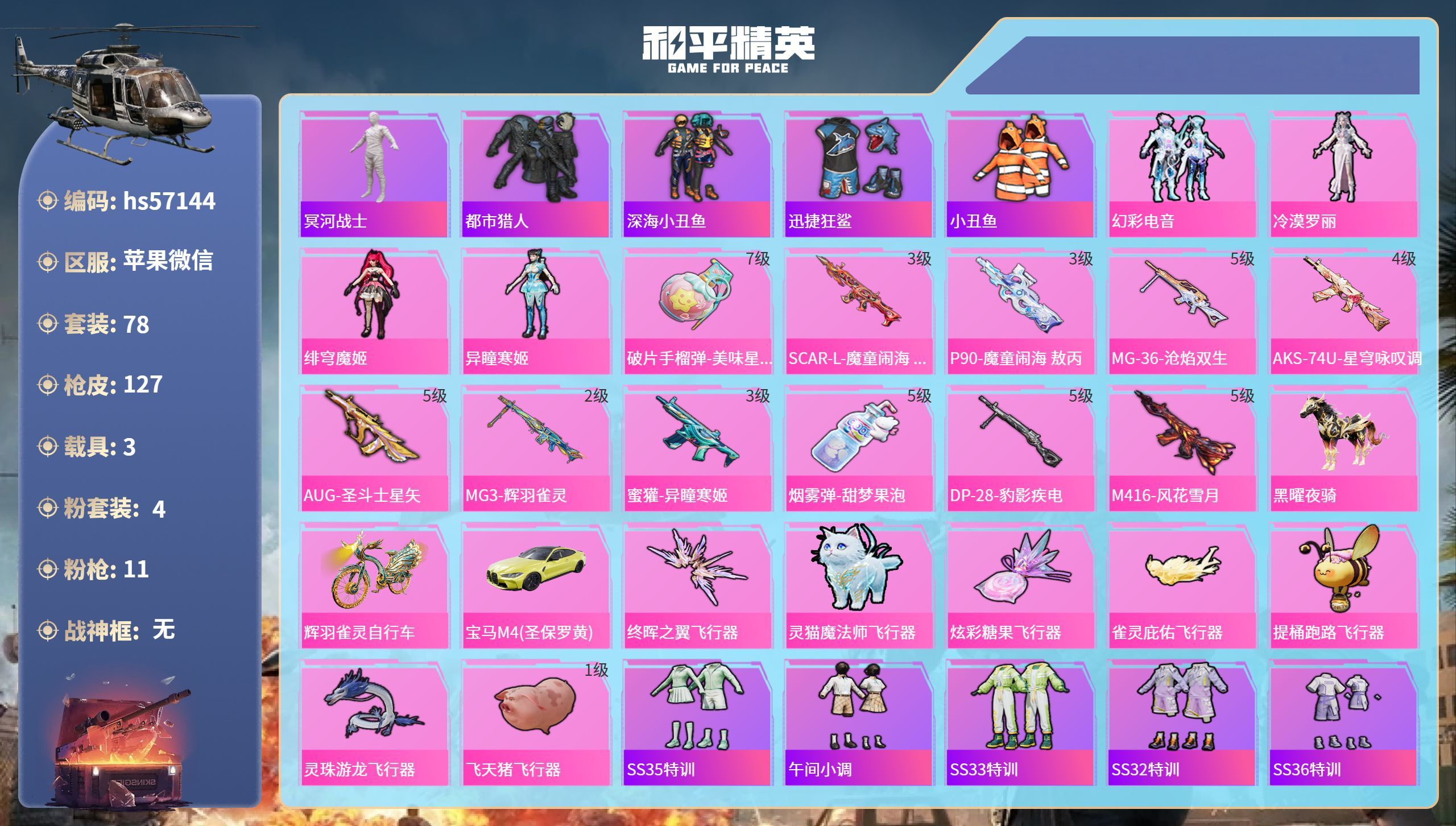 hs57144苹果v-5王牌印记-4粉装-11特效枪-3载具-44378热力值-78套装-127枪