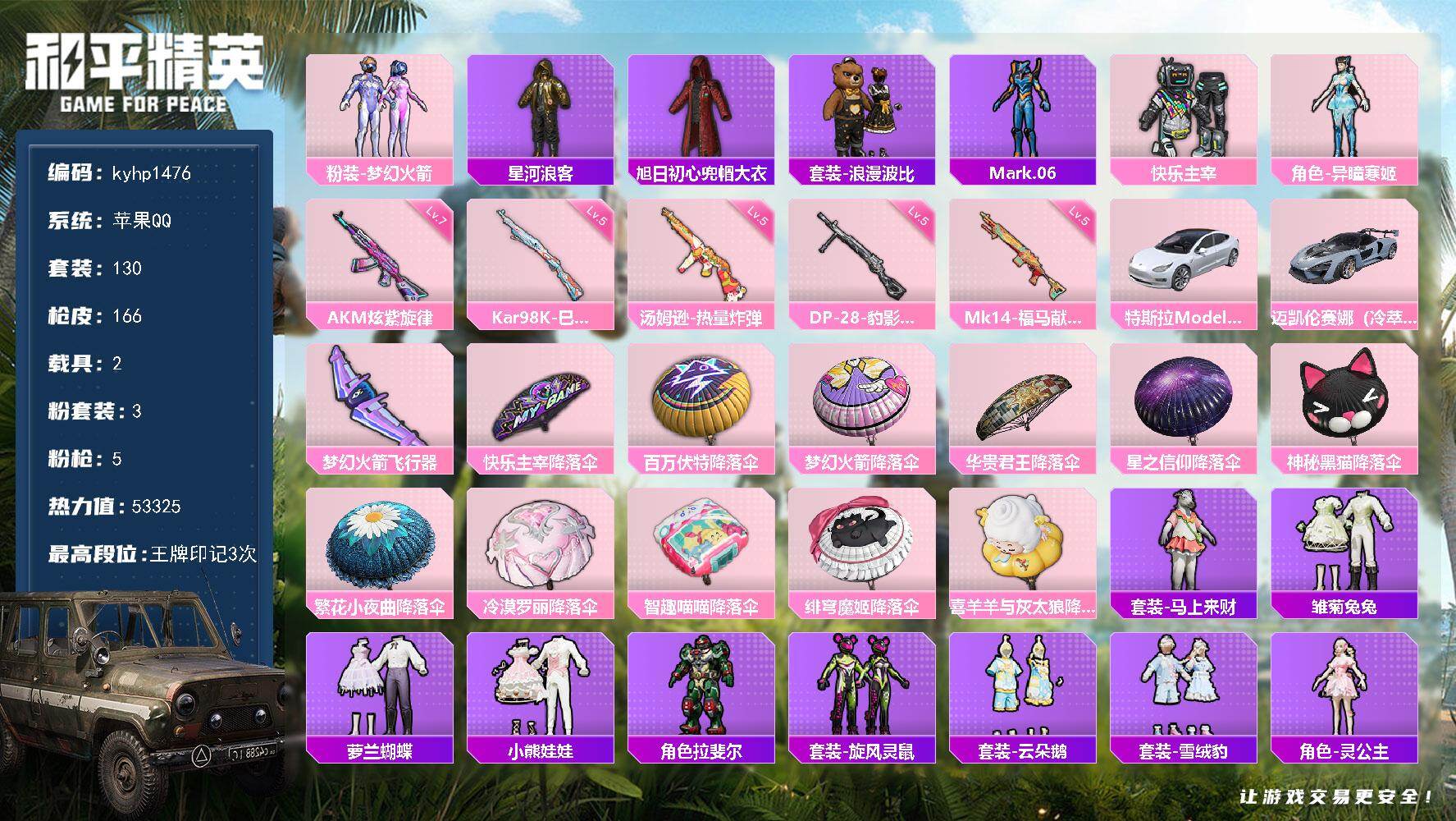 苹果 手Q-3粉装-5特效枪-2载具-1粉色飞行器-53325热力值-3王牌印