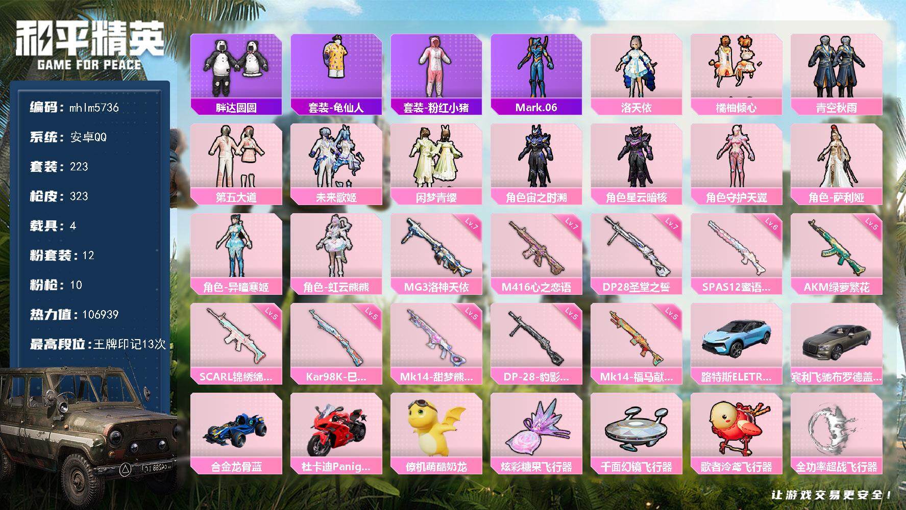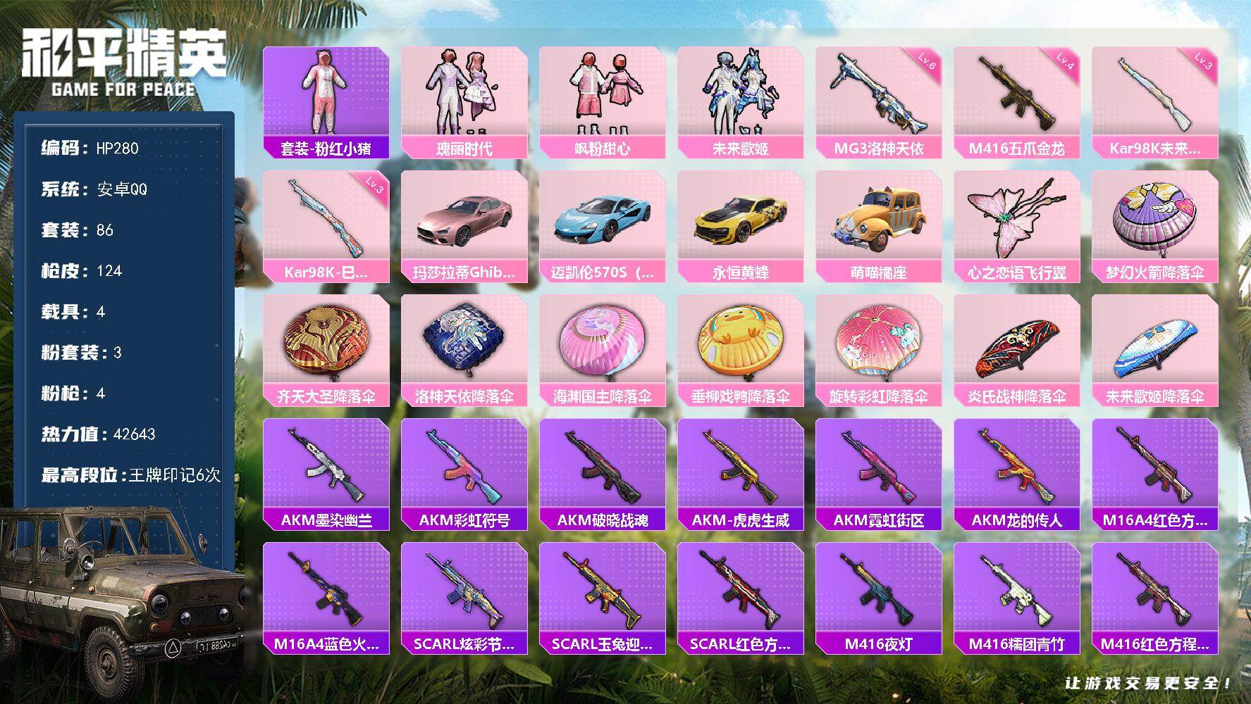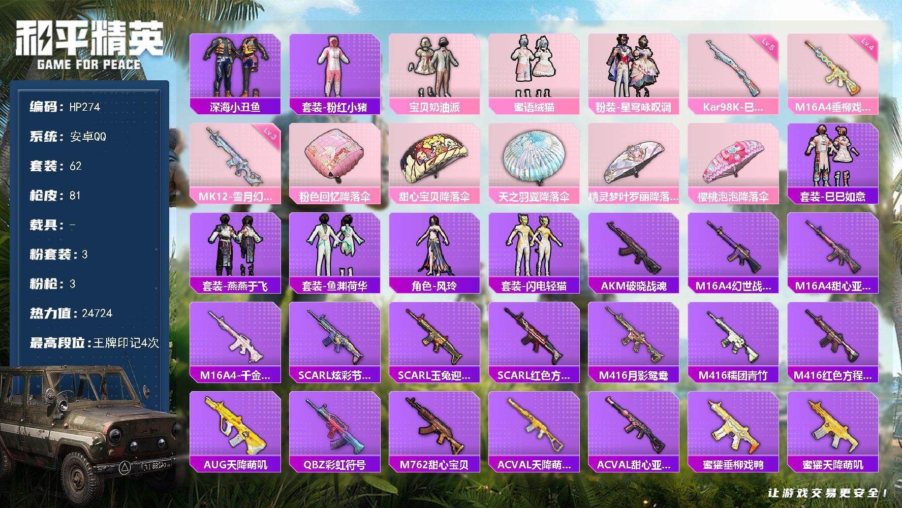 【秒换绑】安卓 手Q-3粉装-3特效枪-0载具-0粉色飞行器-24724热力值