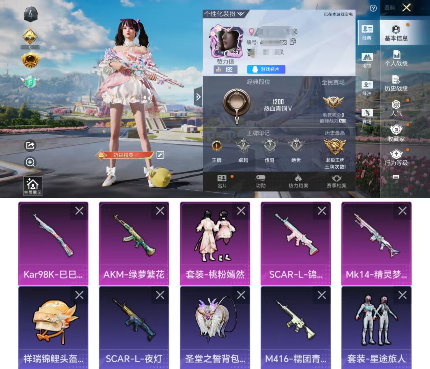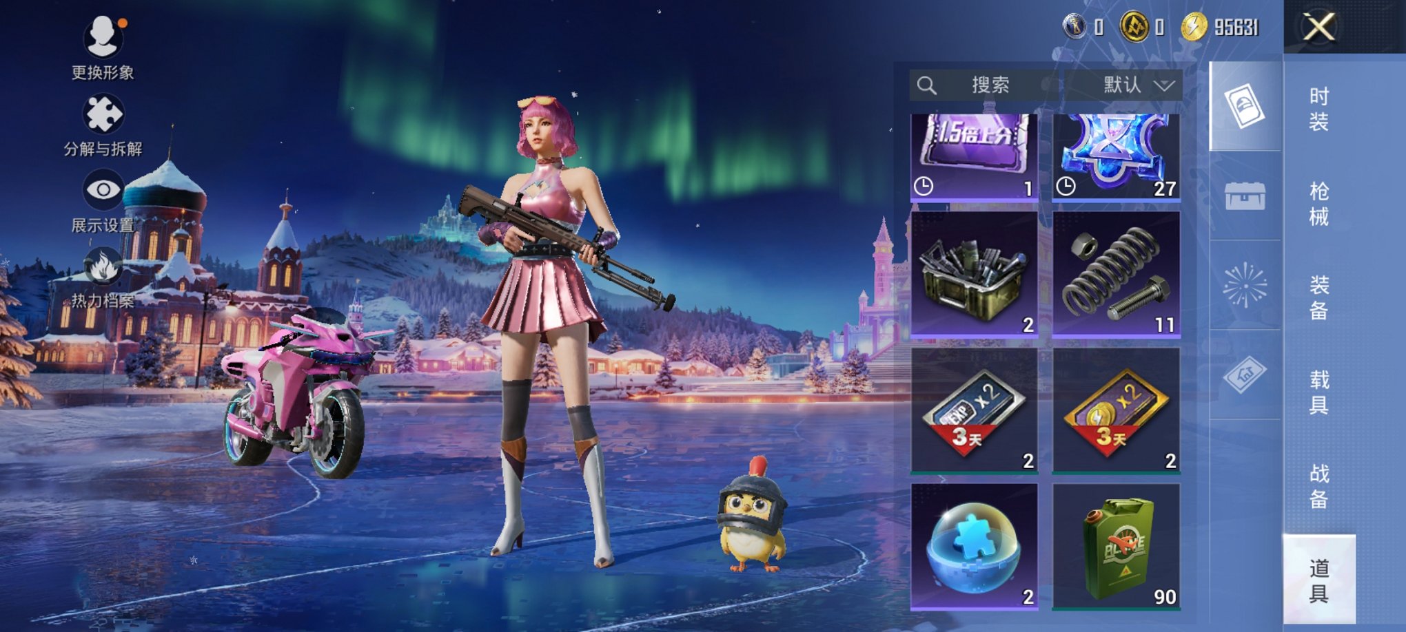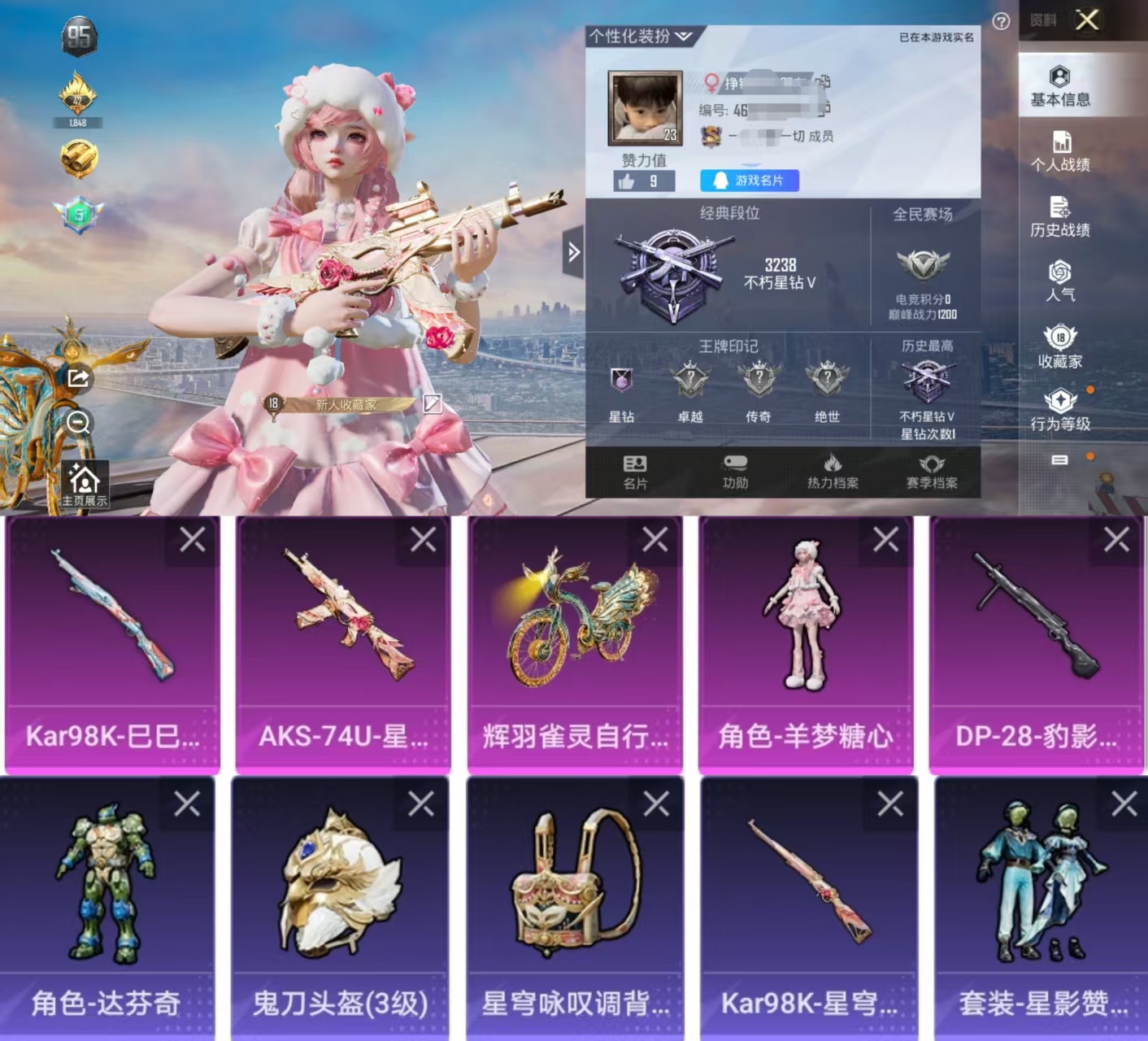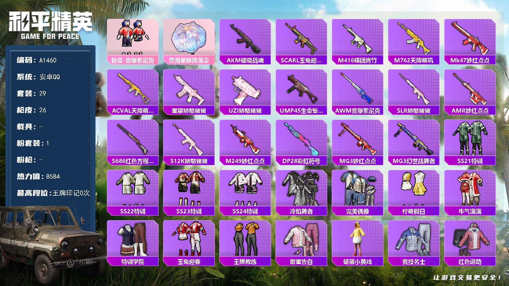 1粉装-0特效枪-0载具-0粉色飞行器-8584热力值-1王牌印记-29套装-26枪皮