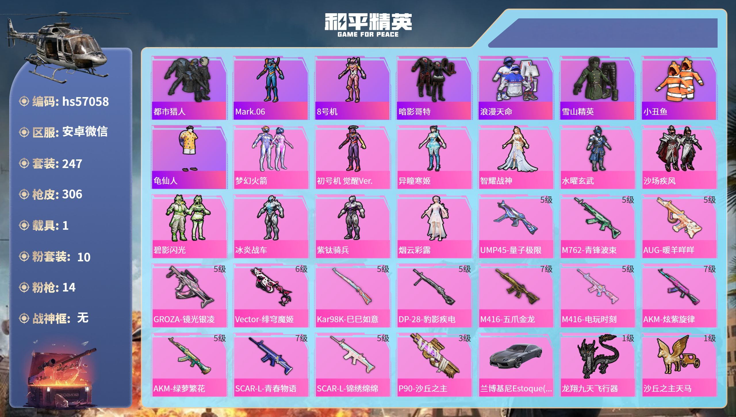 hs57058安卓v-16王牌印记-10粉装-14特效枪-1载具-106530热力值-247套装-