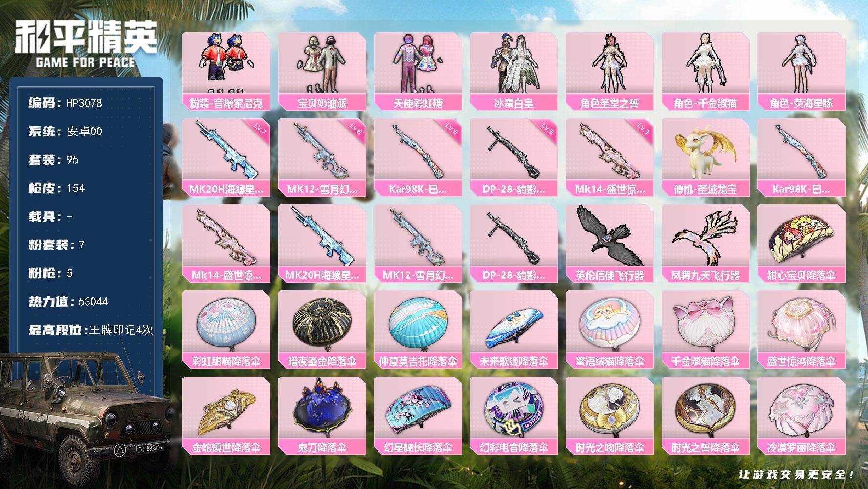 安卓 手Q-7粉装-5特效枪-0载具-3粉色飞行器-53044热力值-4王牌印