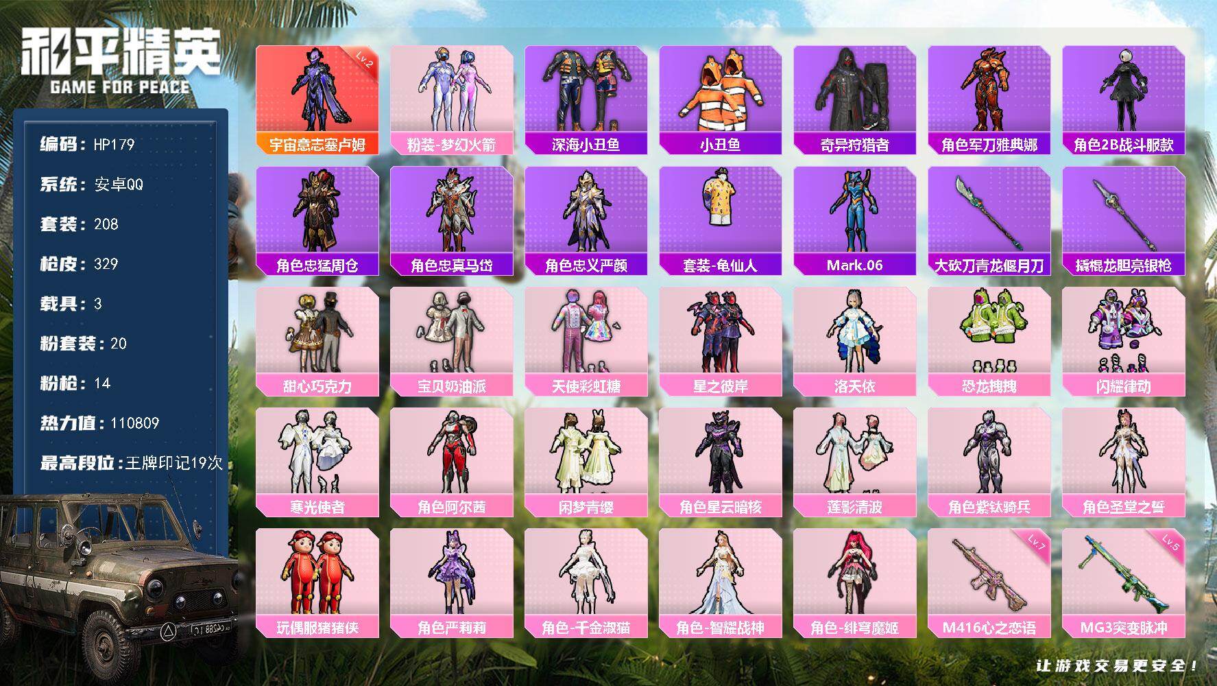 【秒换绑】安卓 手Q-1神装-20粉装-14特效枪-3载具-9粉色飞行器-11