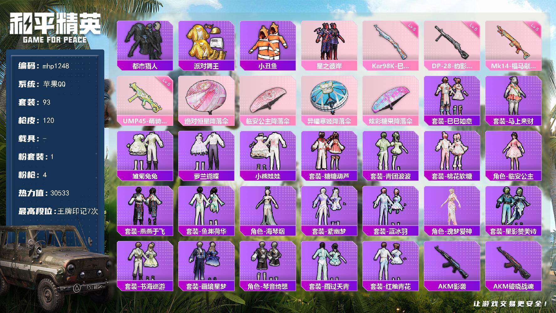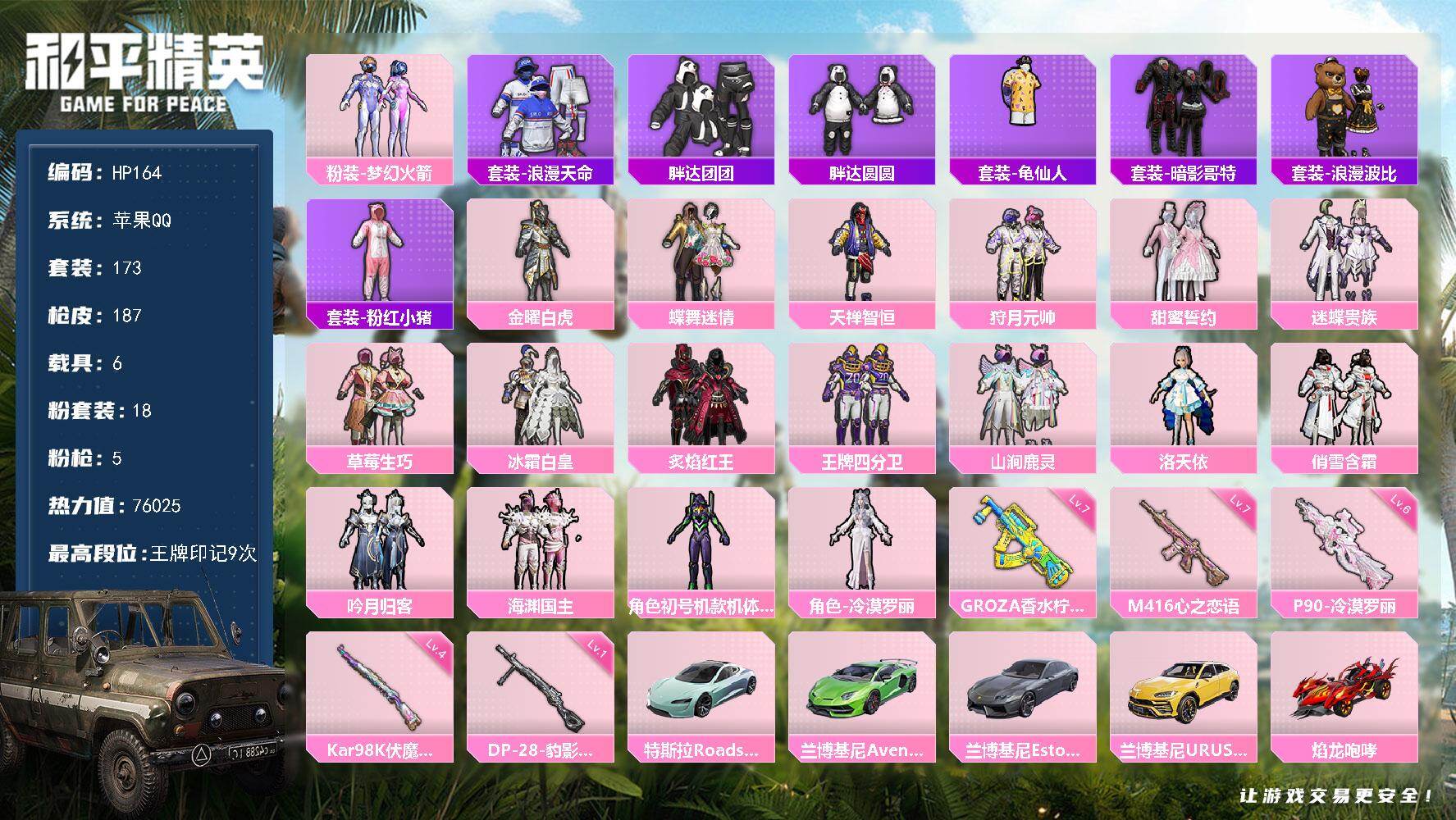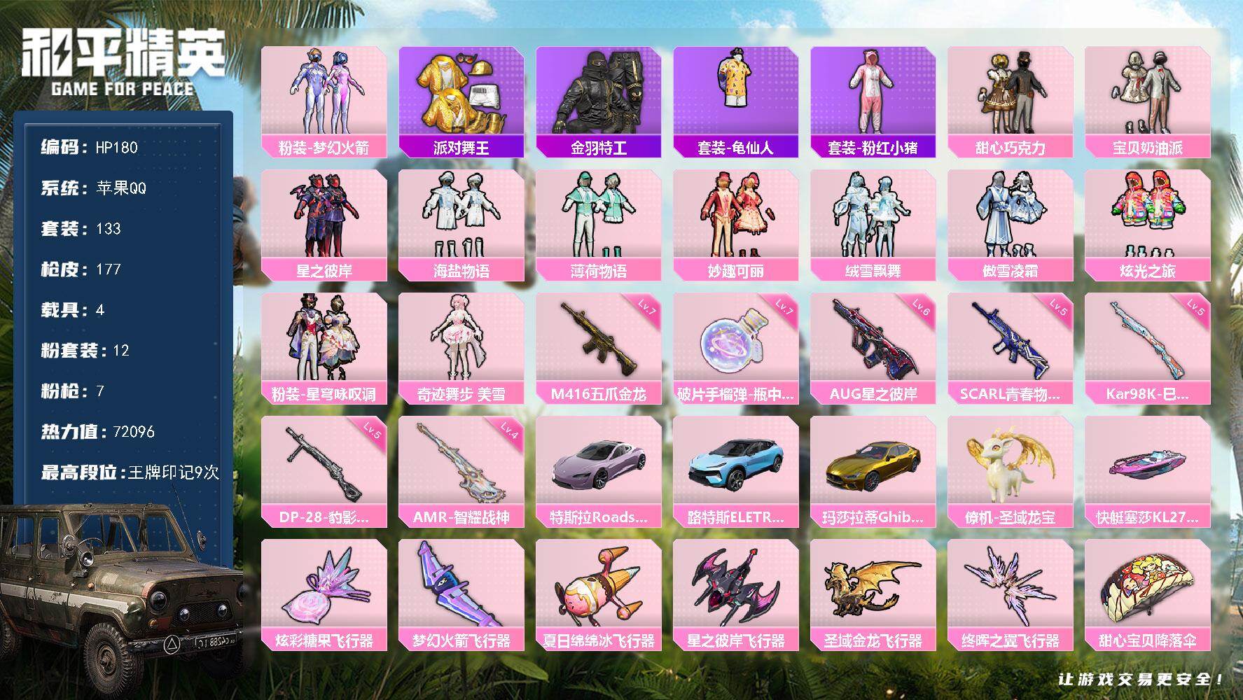 【秒换绑】安卓 手Q-3粉装-3特效枪-0载具-0粉色飞行器-33172热力值