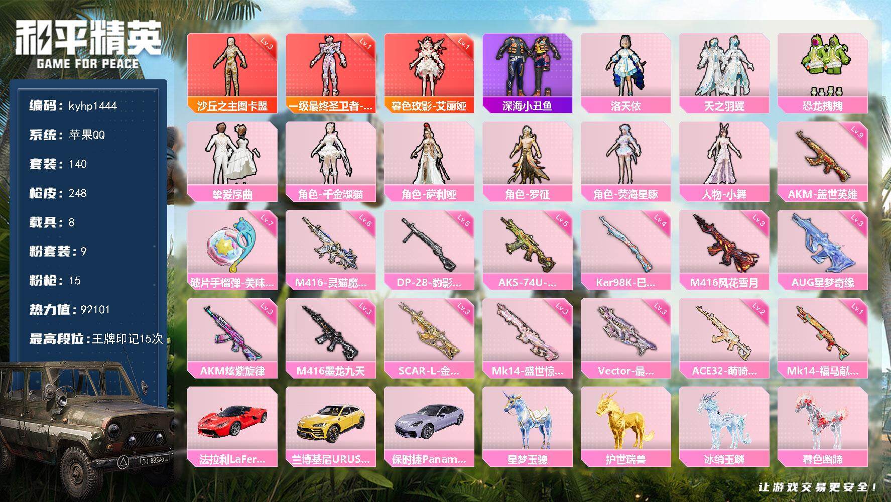 苹果 手Q-3神装-9粉装-15特效枪-8载具-14粉色飞行器-92101热力