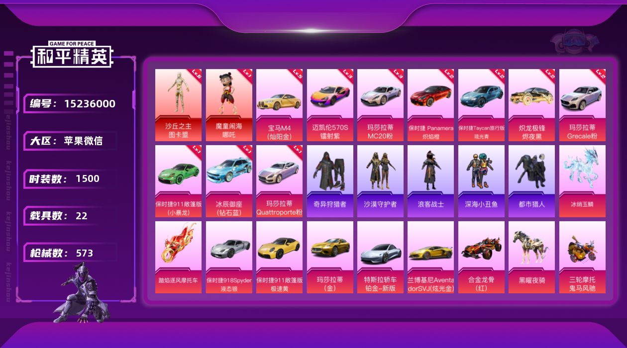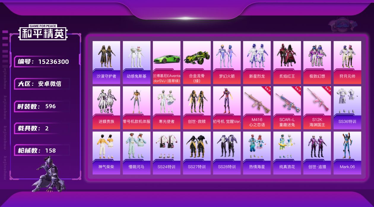 实名: 可修改 时装数: 596 载具数: 2 枪械数: 158 战备数: 14